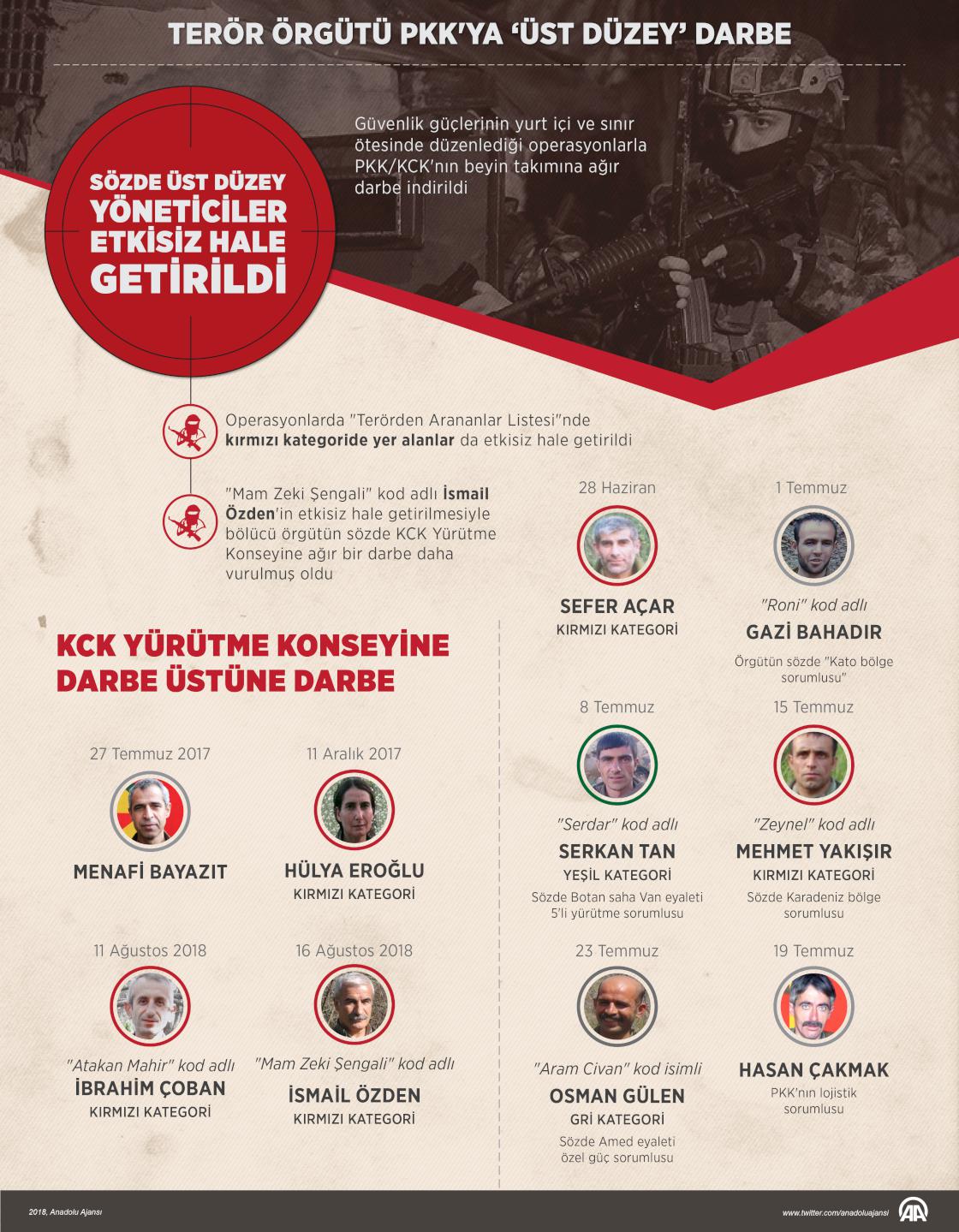 Güvenlik güçlerinin yurt içi ve sınır ötesinde düzenlediği operasyonlarla PKK/KCK'nın beyin takımına ağır darbe indirildi. Operasyonlarda "Terörden Arananlar Listesi"nde kırmızı kategoride yer alanlar da etkisiz hale getirildi. "Mam Zeki Şengali" kod adlı İsmail Özden'in etkisiz hale getirilmesiyle bölücü örgütün sözde KCK Yürütme Konseyine ağır bir darbe daha vurulmuş oldu. ( Murat Usubaliev - Anadolu Ajansı )16 Ağustos 2018•Güncelleme: 16 Ağustos 2018