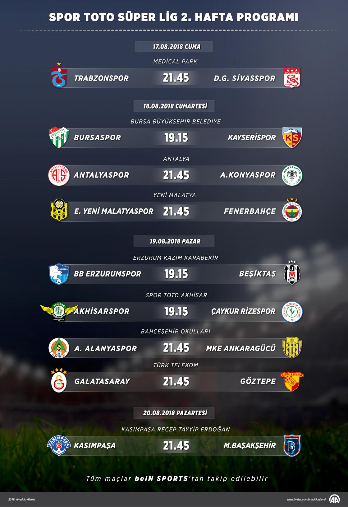 Spor Toto Süper Lig'de 2. haftanın açılış maçında bugün Trabzonspor ile Demir Grup Sivasspor karşı karşıya gelecek. Ligde 18 Ağustos Cumartesi 3, 19 Ağustos Pazar günü 4 maç, 20 Ağustos Pazartesi günü ise tek maç oynanacak. ( Ahmet Burak Özkan - Anadolu Ajansı )17 Ağustos 2018•Güncelleme: 17 Ağustos 2018