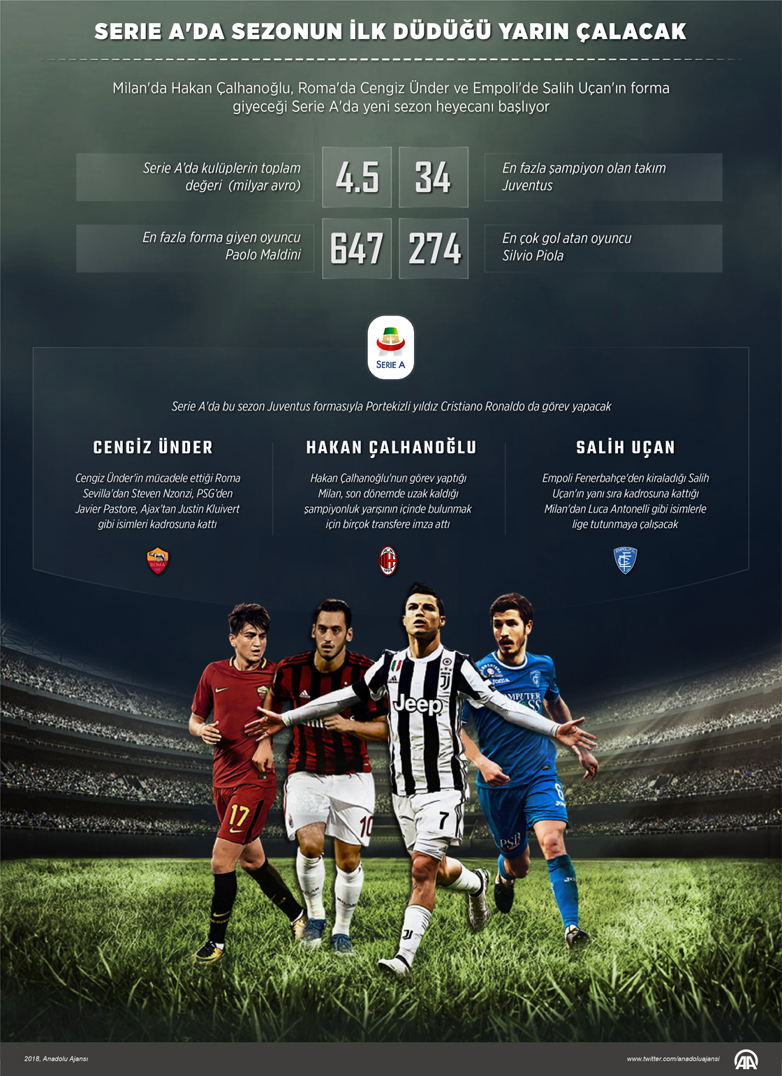 Türk oyuncular Hakan Çalhanoğlu, Cengiz Ünder ve Salih Uçan'ın mücadele edeceği İtalya 1. Futbol Ligi'nde (Serie A) 2018-2019 sezonunun ilk düdüğü, yarın çalacak. Sezonun açılış maçında, son 7 yıldır şampiyonluğa uzanan ligin en başarılı takımı Juventus, yarın TSİ 19.00'da Chievo'ya konuk olacak. Günün diğer mücadelesinde ise bu sezon yine zirve mücadelesi vermesi beklenen Napoli, deplasmanda Lazio ile TSİ 21.30'da karşılaşacak.