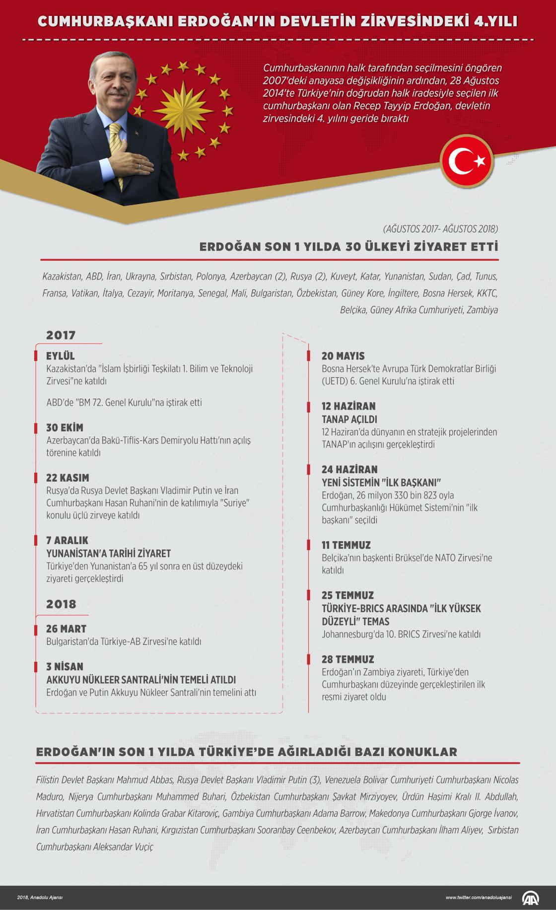 Cumhurbaşkanının halk tarafından seçilmesini öngören 2007'deki anayasa değişikliğinin ardından, 28 Ağustos 2014'te Türkiye'nin doğrudan halk iradesiyle seçilen ilk cumhurbaşkanı olan Recep Tayyip Erdoğan, devletin zirvesindeki 4. yılını geride bıraktı