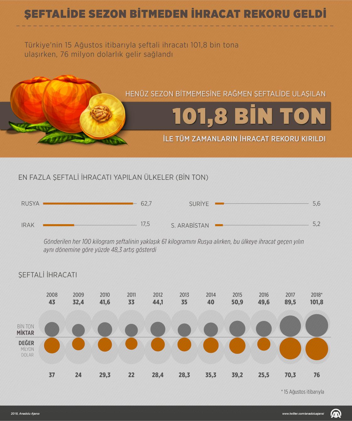 AA muhabirinin Uludağ İhracatçı Birliklerinden aldığı bilgiye göre, Türkiye'nin 15 Ağustos itibarıyla şeftali ihracatı 101,8 bin tona ulaşırken, 76 milyon dolarlık gelir sağlandı. Söz konusu dönemde en fazla ihracat, 62,7 bin tonla Rusya'ya yapıldı. Türkiye'den gönderilen her 100 kilogram şeftalinin yaklaşık 61 kilogramını Rusya aldı.