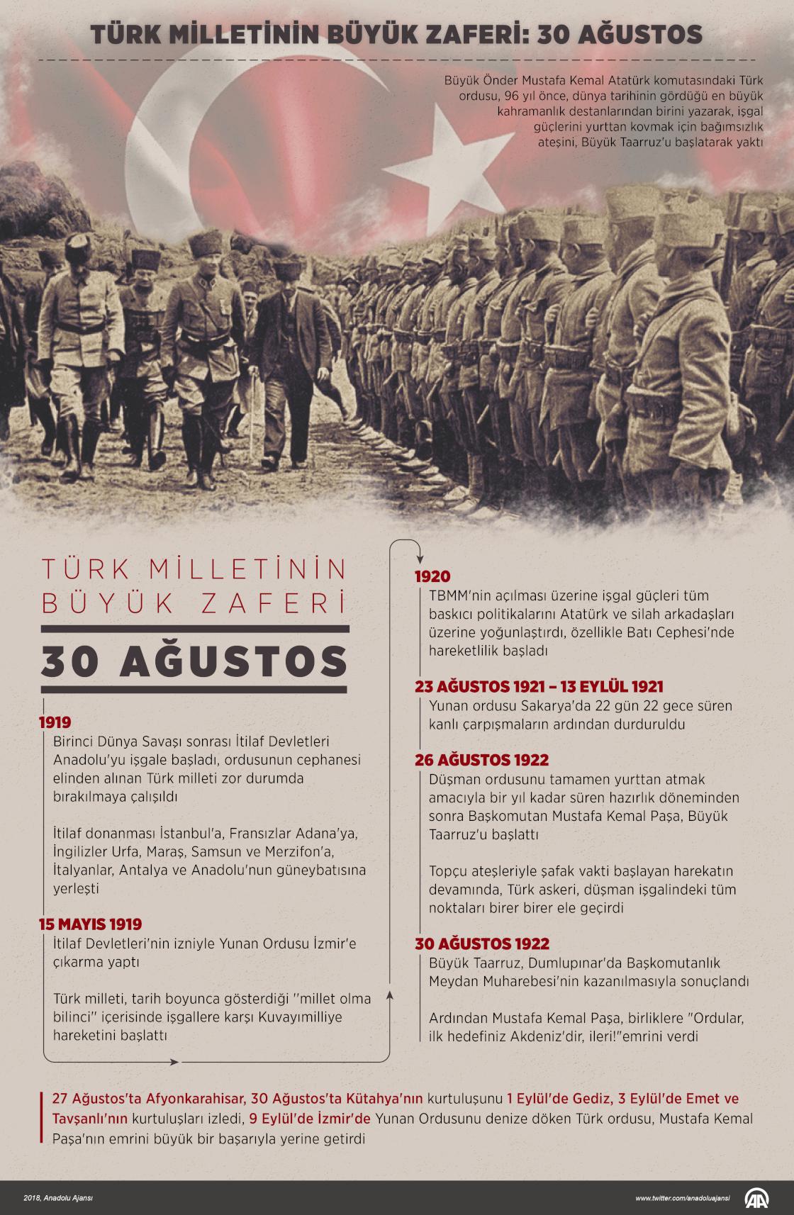 Büyük Önder Mustafa Kemal Atatürk komutasındaki Türk ordusu, 96 yıl önce bugün, dünya tarihinin gördüğü en büyük kahramanlık destanlarından birini yazarak, işgal güçlerini yurttan kovmak için bağımsızlık ateşini, Büyük Taarruz'u başlatarak yaktı.
