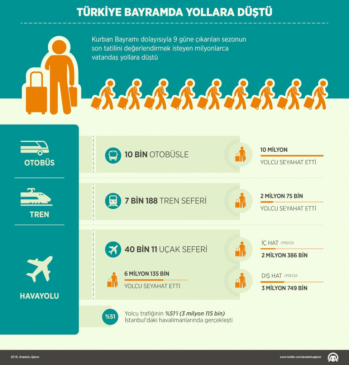 Ulaştırma ve Altyapı Bakanı Cahit Turhan, Kurban Bayramı dolayısıyla 9 güne çıkarılan sezonun son tatilini değerlendirmek isteyen vatandaşların yollara düştüğünü belirterek, turizme yönelik havalimanlarından 6 milyon 135 bin yolcunun hizmet aldığını, 10 milyon yolcunun otobüsle, 2 milyon 75 bin vatandaşın da trenle seyahat etmeyi tercih ettiğini bildirdi. ( Ahmet Burak Özkan - Anadolu Ajansı )29 Ağustos 2018•Güncelleme: 29 Ağustos 2018