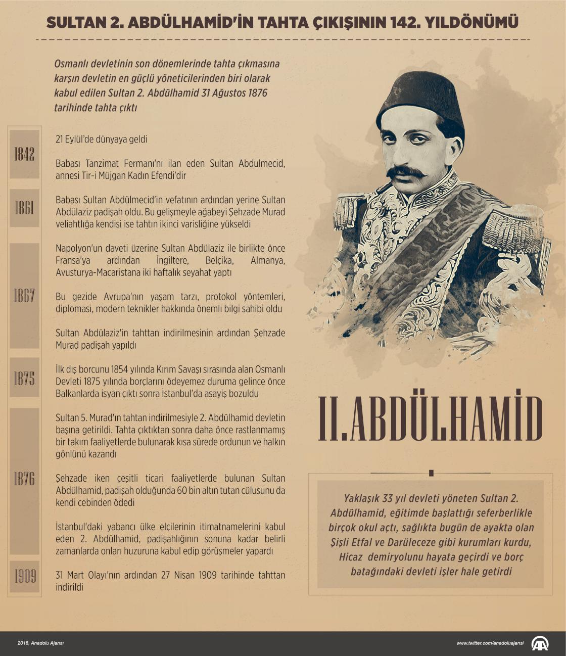 Sultan Abdülaziz'in darbeyle indirilmesi ve yerine getirilen 5. Murad'ın da akli dengesini yitirmesiyle 31 Ağustos 1876'da tahta çıkan Sultan 2. Abdülhamid, eğitim, sağlık, iktisat ve askeri alanlarda önemli hizmetlere imza attı. Osmanlı devletinin son dönemlerinde tahta çıkmasına karşın devletin en güçlü yöneticilerinden biri olarak kabul edilen Sultan 2. Abdülhamid, 21 Eylül 1842 tarihinde dünyaya geldi. Babası Tanzimat Fermanı'nı ilan eden Sultan Abdulmecid, annesi Tir-i Müjgan Kadın Efendi'dir. Sultan İkinci Abdülhamid 11 yaşında iken annesini kaybettiği için öksüz büyüdü ve onunla Piristu Kadın Efendi ilgilendi. ( Kemal Delikmen - Anadolu Ajansı )31 Ağustos 2018•Güncelleme: 31 Ağustos 2018