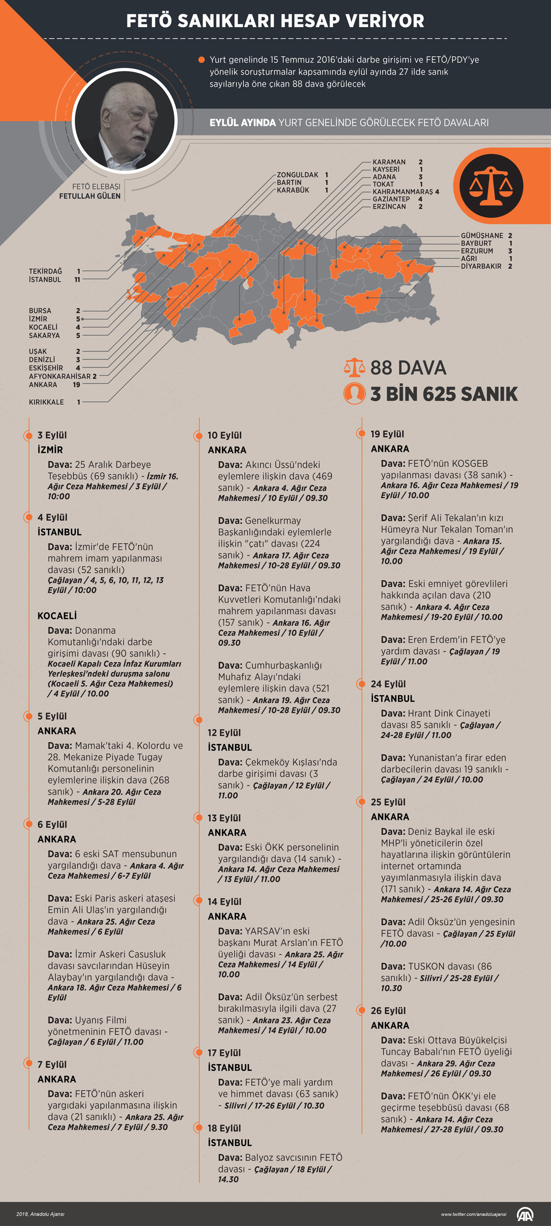 Ülke genelinde 15 Temmuz 2016'daki darbe girişimi ve Fetullahçı Terör Örgütü/Paralel Devlet Yapılanması'na (FETÖ/PDY) ilişkin, eylül ayında 27 ilde sanık sayılarıyla öne çıkan 88 davaya bakılacak. ( Yasin Demirci - Anadolu Ajansı )