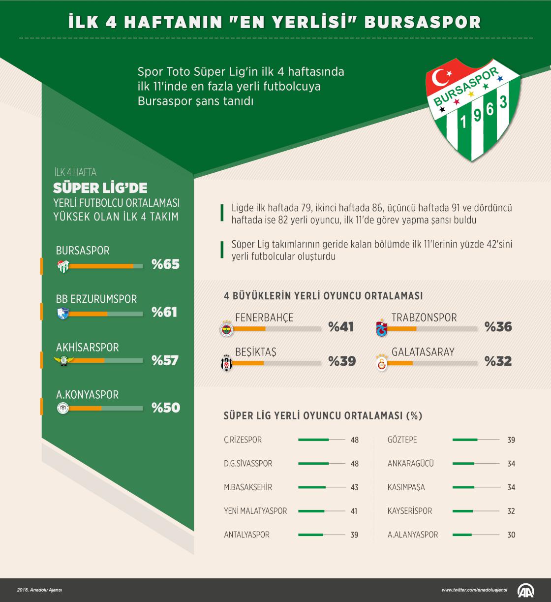 Spor Toto Süper Lig'in ilk 4 haftasında ilk 11'inde en fazla yerli futbolcuya Bursaspor şans tanıdı. Süper Lig'de 2018-2019 sezonunun ilk 4 haftası tamamlanırken, takımların ilk 11'lerindeki yerli ve yabancı oyuncu sayıları dikkati çekiyor. Ligde ilk haftada 79, ikinci haftada 86, üçüncü haftada 91 ve dördüncü haftada ise 82 yerli oyuncu, ilk 11'de görev yapma şansı buldu. Süper Lig takımlarının geride kalan bölümde ilk 11'lerinin yüzde 42'sini yerli futbolcular oluşturdu.