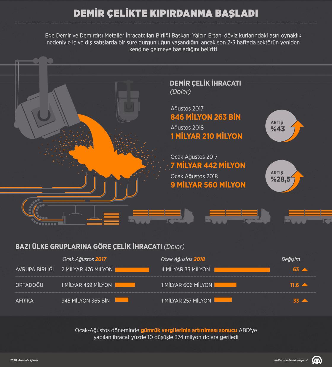 Ege Demir ve Demirdışı Metaller İhracatçıları Birliği Başkanı Yalçın Ertan, demir çelik ürünlerinde iç ve dış talepte hareketlenme görüldüğünü belirterek, ABD'nin gümrük vergisi koymasından kaynaklanan boşluğun rahatlıkla doldurulacağını, iç piyasada da talebin artarak sürmesini beklediklerini söyledi. Ertan, AA muhabirine, döviz kurlarındaki dalgalanma nedeniyle iç ve dış satışlarda bir süre durgunluğun yaşandığını ancak son 2-3 haftada sektörün yeniden kendine gelmeye başladığını belirtti. ( Murat Usubaliev - Anadolu Ajansı )05 Eylül 2018•Güncelleme: 05 Eylül 2018