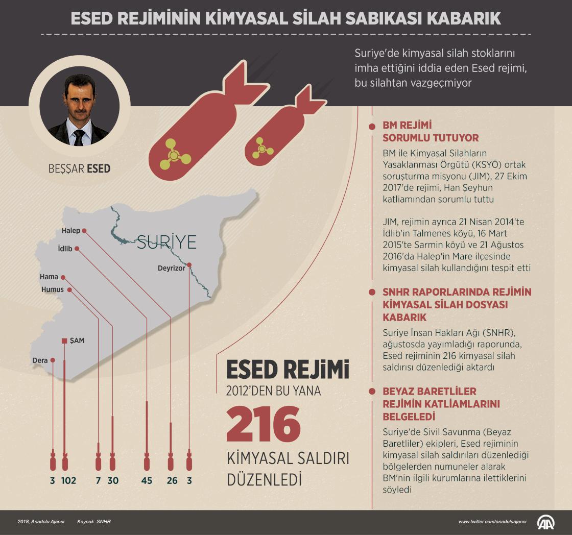 Suriye'de kimyasal silah stokunu imha ettiğini ileri süren Beşşar Esed rejimi, muhaliflerin kontrol ettiği sivil yerleşimlere son 6 yılda 216 kez kimyasal silah saldırısı düzenleyerek uluslararası toplumun tepkisini çeken bu yönteme sıkça başvurduğunu gösterdi.