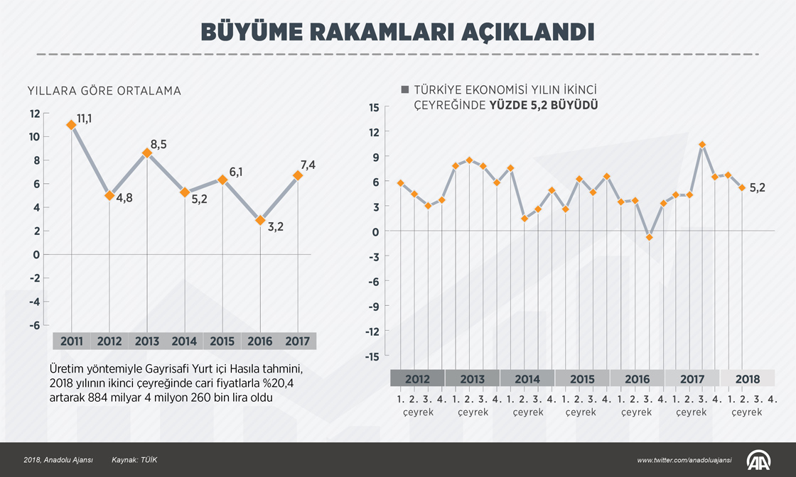 Türkiye İstatistik Kurumu (TÜİK), bu yılın ikinci çeyreğine (nisan-haziran) ilişkin gayrisafi yurt içi hasıla (GSYH) sonuçlarını açıkladı. Türkiye ekonomisi yılın ikinci çeyreğinde yüzde 5,2 büyüdü. ( Ahmet Burak Özkan - Anadolu Ajansı )