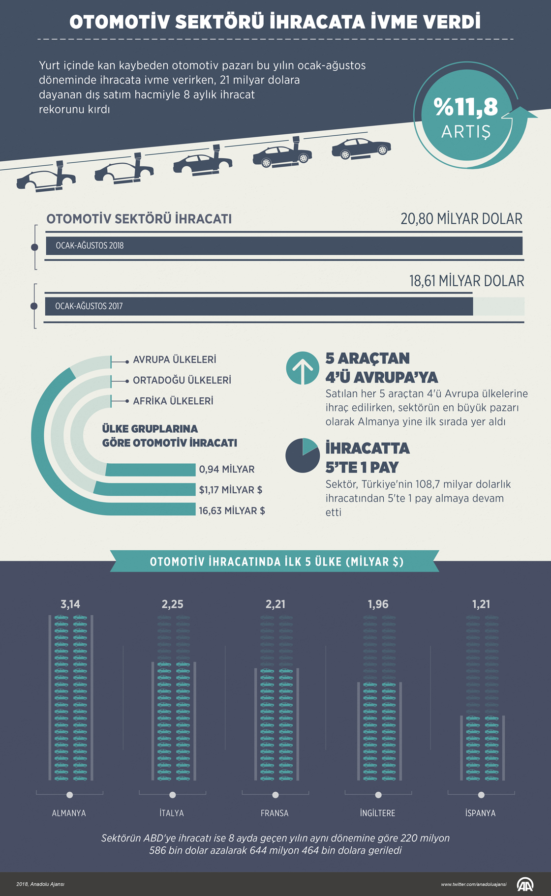 Yurt içinde pazardaki daralmanın etkisiyle kan kaybeden otomotiv endüstrisi ocak-ağustos döneminde ihracatına ivme vererek 21 milyar dolara yakın dış satıma imza atarken, bu rakam sektörün 8 aylık ihracat rekoru olarak kayıtlara geçti. ( Muhammed Ali Yiğit - Anadolu Ajansı )10 Eylül 2018•Güncelleme: 10 Eylül 2018