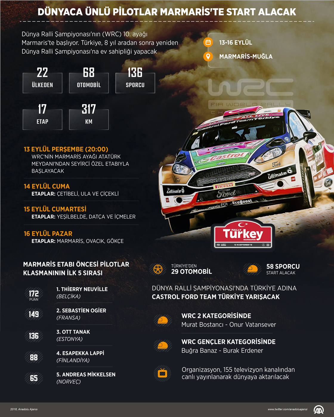 Dünya Ralli Şampiyonası'nın (WRC) 10. ayağı yarın Marmaris'te başlayacak. Türkiye, 8 yıl aradan sonra yeniden Dünya Ralli Şampiyonası'na ev sahipliği yapacak. Marmaris merkezli olarak Muğla ve çevresinde gerçekleştirilecek şampiyonada dünyaca ünlü pilotlar, yeşil ve mavinin buluştuğu bölgede otomobil tutkunlarına heyecanlı anlar yaşatacak. 22 ülkeden 68 otomobil ve 136 sporcunun katılımına sahne olacak organizasyon, 16 Eylül Pazar günü sona erecek. ( Ahmet Burak Özkan - Anadolu Ajansı )12 Eylül 2018•Güncelleme: 12 Eylül 2018