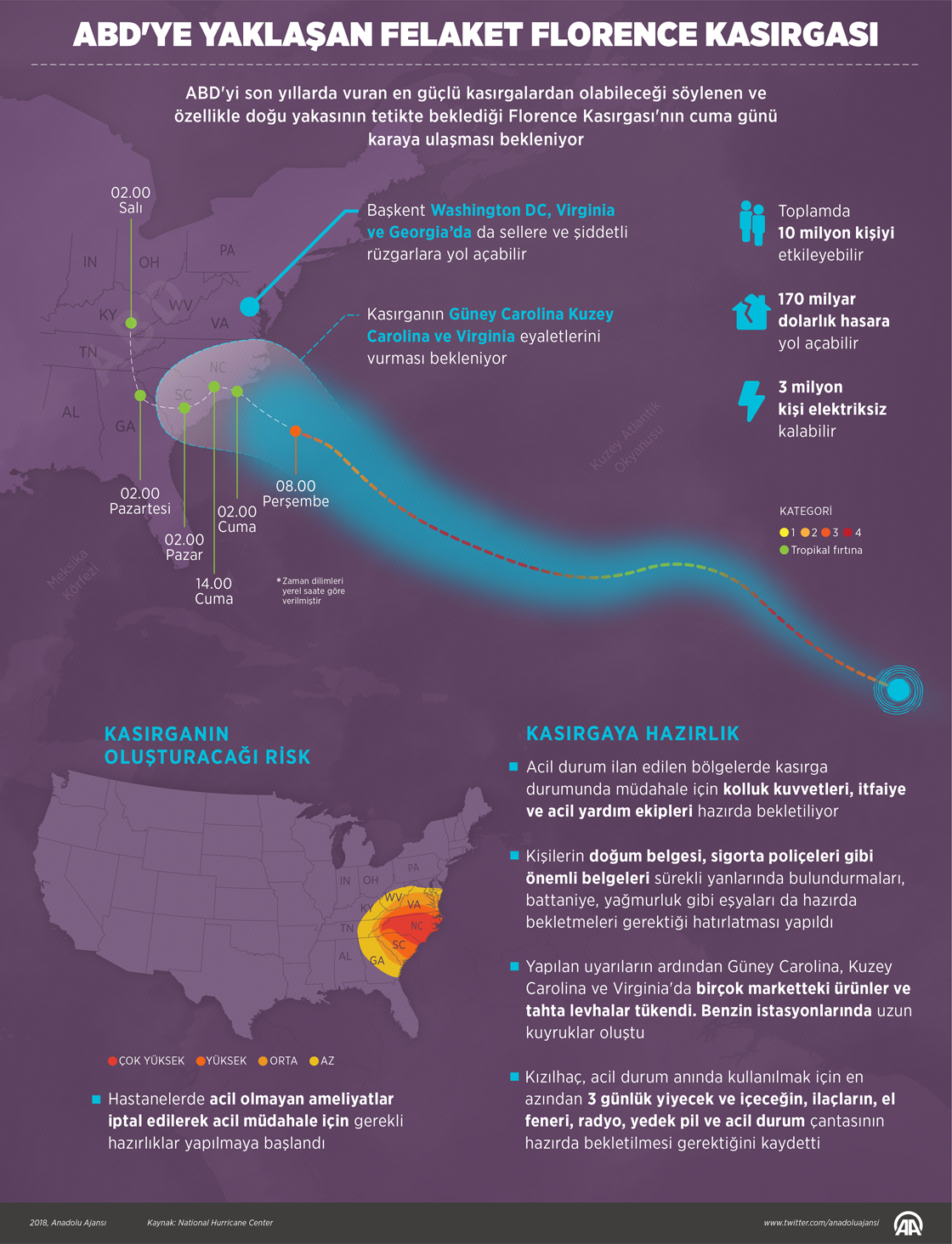 ABD'ye cumartesi günü ulaşması beklenen Florence kasırgasının ABD'de son yıllarda görülen en şiddetli kasırgalardan biri olabileceği belirtiliyor. Kasırganın doğrudan vurması beklenen ABD'nin doğu yakasındaki Güney Carolina, Kuzey Carolina ve Virginia eyaletlerinde 1,7 milyon kişi için tahliye emri verildi. ( Yasin Demirci - Anadolu Ajansı )13 Eylül 2018•Güncelleme: 13 Eylül 2018