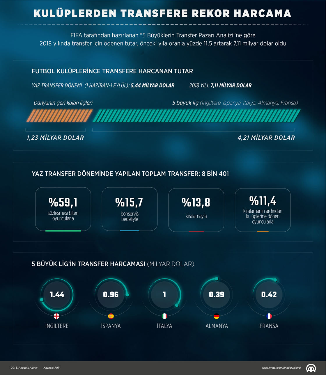 Bu yıl transfere dünya genelindeki futbol kulüplerinin harcadığı tutar, 7 milyar doları aşarak rekor seviyeye ulaştı. FIFA tarafından hazırlanan "5 Büyüklerin Transfer Pazarı Analizi"ne göre, 2018 yılında transfer için ödenen tutar, önceki yıla oranla yüzde 11,5 artarak 7,11 milyar dolar oldu.