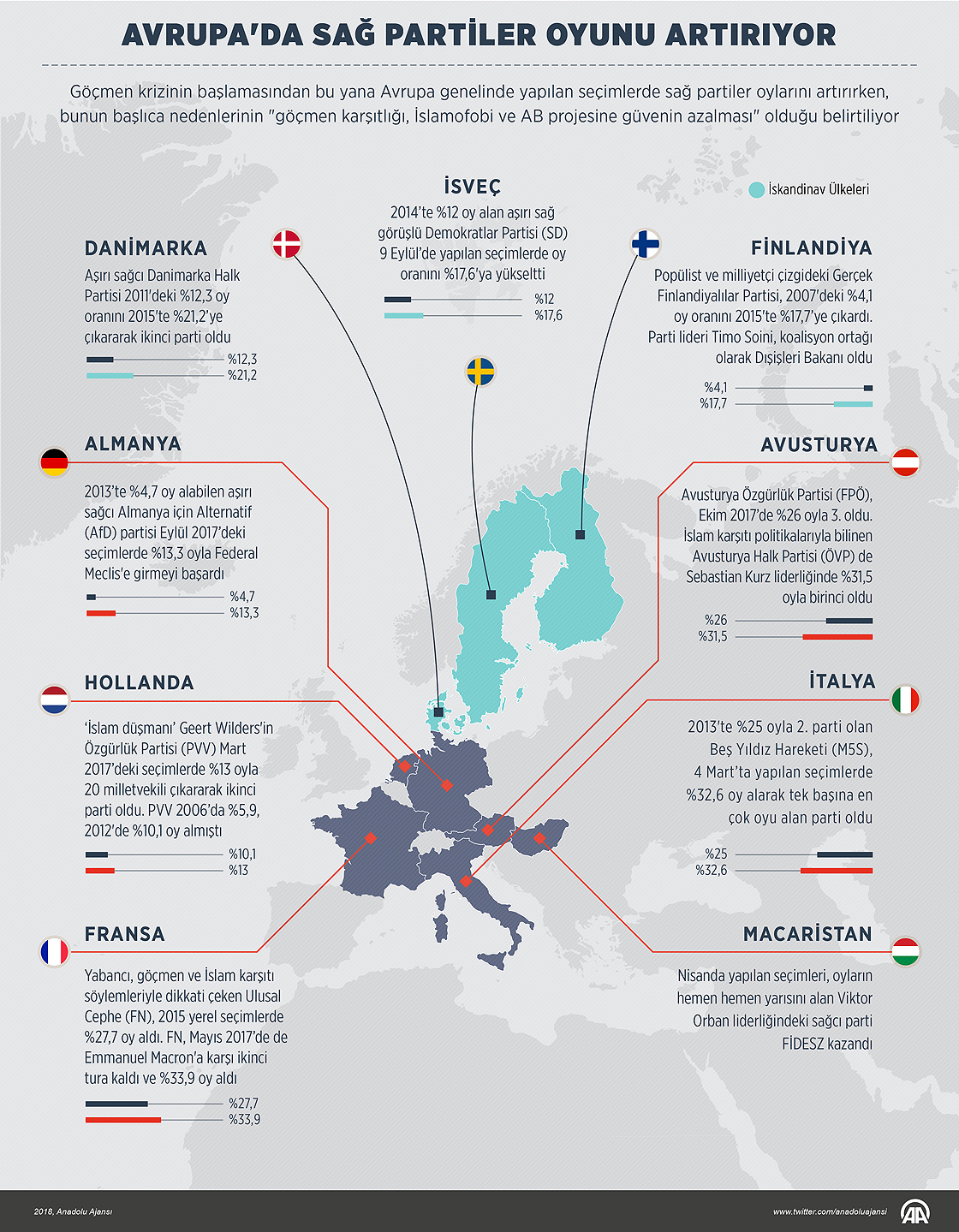 Göçmen krizinin başlamasından bu yana Avrupa genelinde yapılan seçimlerde sağ partiler oylarını artırırken, bunun başlıca nedenlerinin "göçmen karşıtlığı, İslamofobi ve AB projesine güvenin azalması" olduğu belirtiliyor.