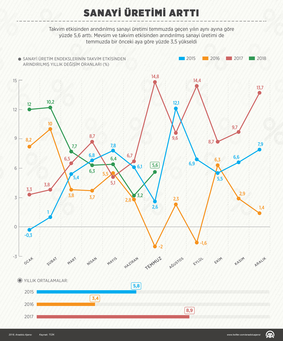 Türkiye İstatistik Kurumu (TÜİK), temmuz ayına ilişkin sanayi üretim endeksi sonuçlarını açıkladı. Takvim etkisinden arındırılmış sanayi üretimi temmuzda geçen yılın aynı ayına göre yüzde 5,6 arttı. Mevsim ve takvim etkisinden arındırılmış sanayi üretimi de temmuzda bir önceki aya göre yüzde 3,5 yükseldi. ( Ahmet Burak Özkan - Anadolu Ajansı )17 Eylül 2018•Güncelleme: 17 Eylül 2018
