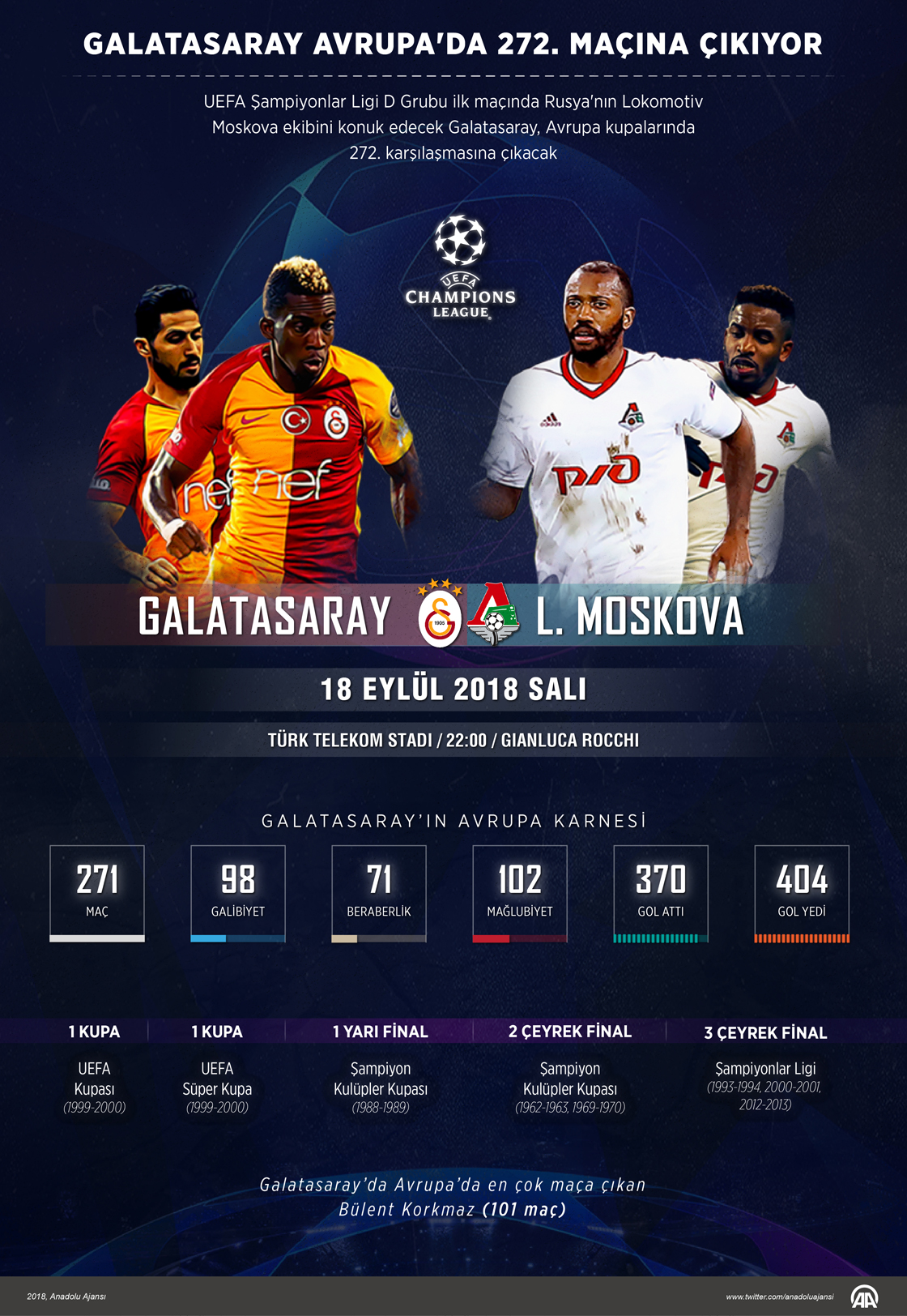 UEFA Şampiyonlar Ligi D Grubu ilk maçında yarın Rusya'nın Lokomotiv Moskova ekibini konuk edecek Galatasaray, Avrupa kupalarında 272. karşılaşmasına çıkacak. ( Muhammed Ali Yiğit - Anadolu Ajansı )