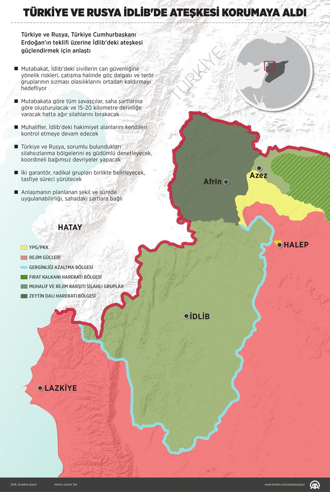 Türkiye ve Rusya, Türkiye Cumhurbaşkanı Recep Tayyip Erdoğan'ın Tahran zirvesindeki teklifi üzerine İdlib'deki ateşkesi güçlendirmek için anlaştı. Mutabakat, İdlib'deki sivillerin can güvenliği yönelik riskleri, olası çatışma halinde göç dalgası ve terör gruplarının sızması olasılıklarını ortadan kaldırmayı hedefliyor. Mutabakata göre tüm savaşçılar, saha şartlarına göre oluşturulacak ve 15-20 kilometre derinliğe varacak hatta ağır silahlarını bırakacak. ( Yasin Demirci - Anadolu Ajansı )18 Eylül 2018•Güncelleme: 18 Eylül 2018