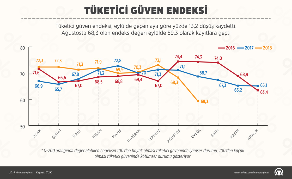 Türkiye İstatistik Kurumu (TÜİK), eylül ayına ilişkin tüketici güven endeksini açıkladı. TÜİK ve Türkiye Cumhuriyet Merkez Bankası iş birliğiyle yürütülen anket sonuçlarından hesaplanan tüketici güven endeksi, eylülde geçen aya göre yüzde 13,2 düşüş kaydetti. Buna göre ağustosta 68,3 olan endeks değeri eylülde 59,3 olarak kayıtlara geçti. ( Ahmet Burak Özkan - Anadolu Ajansı )20 Eylül 2018•Güncelleme: 20 Eylül 2018