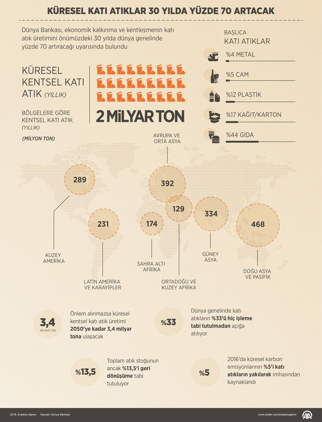 Günümüzde yılda 2 milyar tona ulaşan küresel kentsel katı atık üretimi, 2050 yılına kadar 3,4 milyar tona ulaşacak.