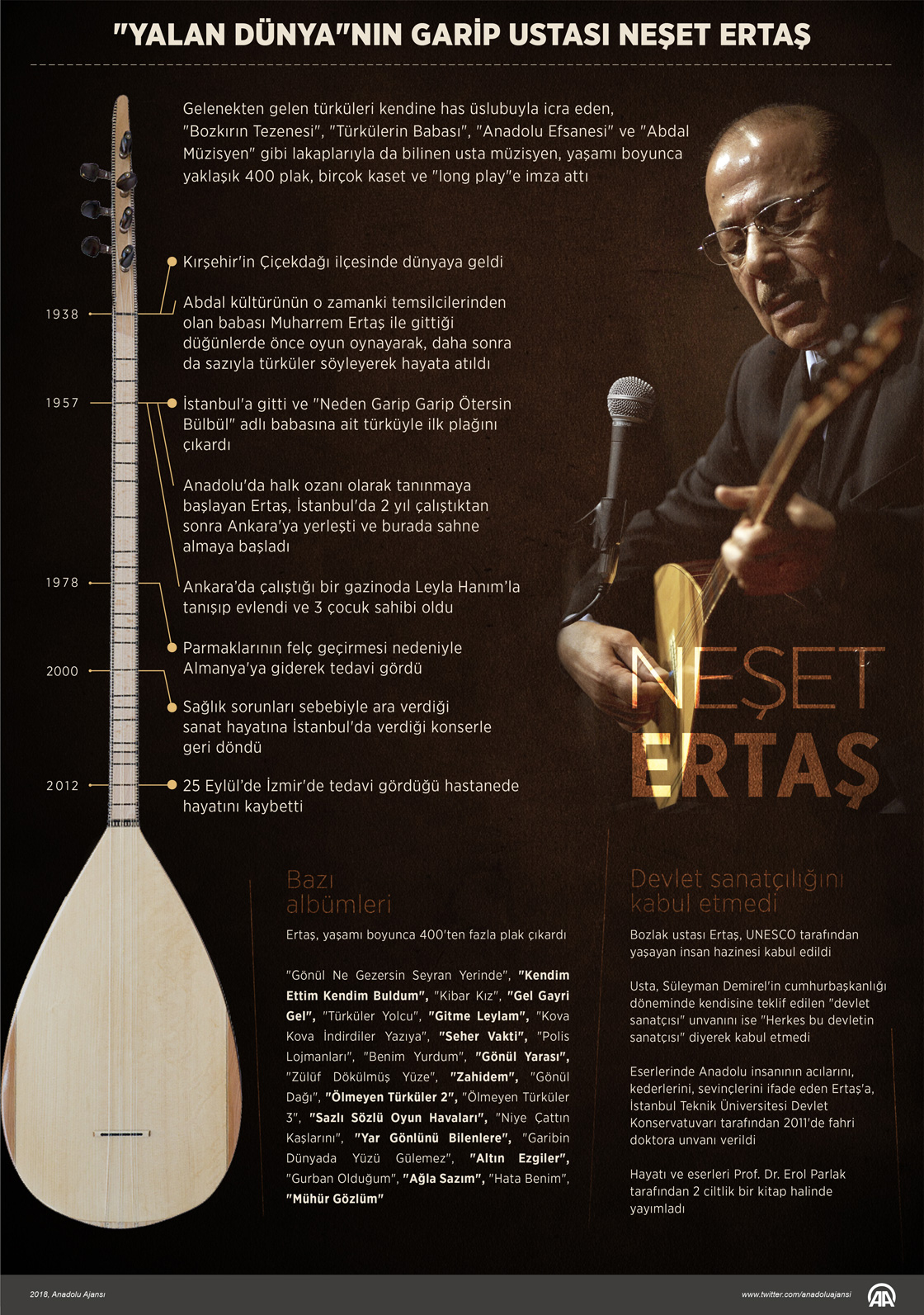 Gelenekten gelen türküleri kendine has üslubuyla icra eden, "Bozkırın Tezenesi", "Türkülerin Babası", "Anadolu Efsanesi" ve "Abdal Müzisyen" gibi lakaplarıyla da bilinen usta müzisyen, yaşamı boyunca yaklaşık 400 plak, birçok kaset ve "long play"e imza attı. ( Yasin Demirci - Anadolu Ajansı )24 Eylül 2018•Güncelleme: 24 Eylül 2018