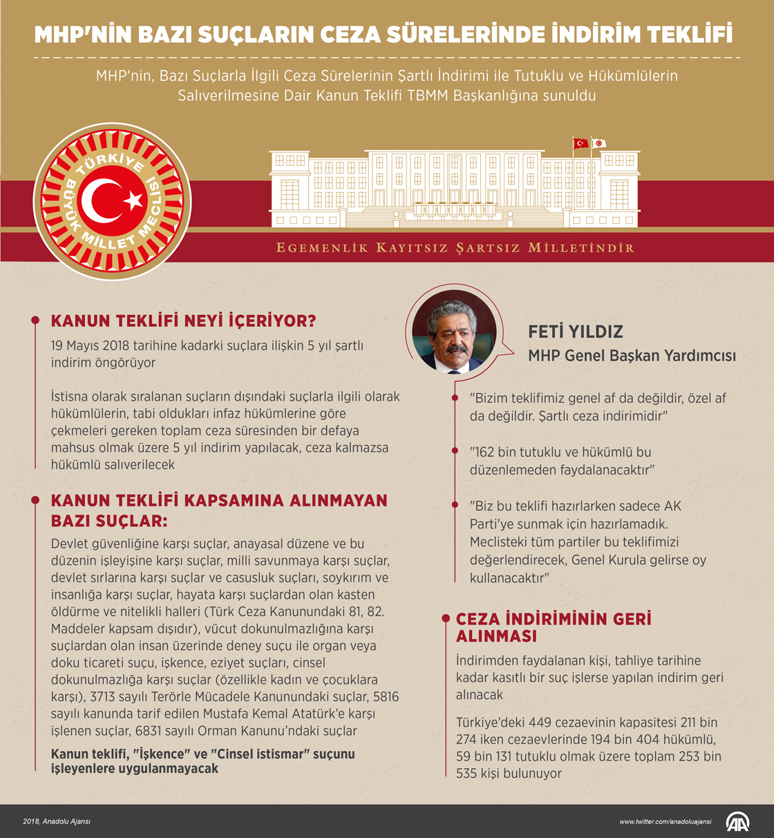MHP, 19 Mayıs 2018 tarihine kadarki suçlara ilişkin 5 yıl şartlı indirim öngören kanun teklifini TBMM Başkanlığına sundu. MHP Genel Başkan Yardımcısı, İstanbul Milletvekili Feti Yıldız, MHP Grup Başkanvekilleri Erkan Akçay ve Erhan Usta ile MHP milletvekillerinin imzasını taşıyan teklif, "Bazı Suçlarla İlgili Ceza Sürelerinden Şartlı İndirim ile Tutuklu ve Hükümlülerin Salıverilmesine Dair Kanun Teklifi" adını taşıyor. Teklif, 19 Mayıs 2018 tarihinden sonraki suçları kapsam dışı bırakıyor. ( Muhammed Ali Yiğit - Anadolu Ajansı )24 Eylül 2018•Güncelleme: 24 Eylül 2018