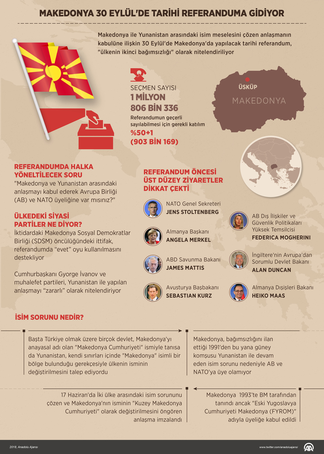 Makedonya ile Yunanistan arasındaki isim sorununu çözen anlaşmaya ilişkin 30 Eylül'de Makedonya'da yapılacak referandum, "ülkenin ikinci bağımsızlığı" olarak nitelendiriliyor. Makedonya tarihinde daha önce yapılan iki referandumun birinde "evet" kazanırken, diğeri yetersiz katılım nedeniyle geçersiz sayıldı. ( Muhammed Ali Yiğit - Anadolu Ajansı )25 Eylül 2018•Güncelleme: 25 Eylül 2018