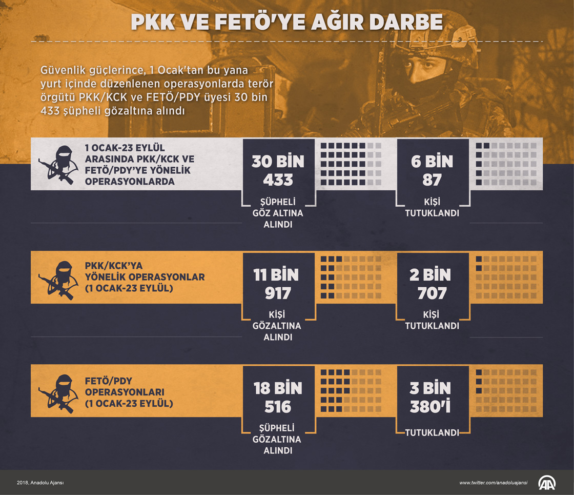 Güvenlik güçlerince 1 Ocak'tan bu yana yurt içinde düzenlenen operasyonlarda, terör örgütü PKK/KCK ve FETÖ/PDY üyesi 30 bin 433 şüpheli gözaltına alındı. Soruşturmalar kapsamında PKK/KCK ve FETÖ/PDY üyesi olduğu gerekçesiyle gözaltına alınanlardan 6 bin 87 kişi tutuklandı. ( Yasin Demirci - Anadolu Ajansı )25 Eylül 2018•Güncelleme: 25 Eylül 2018