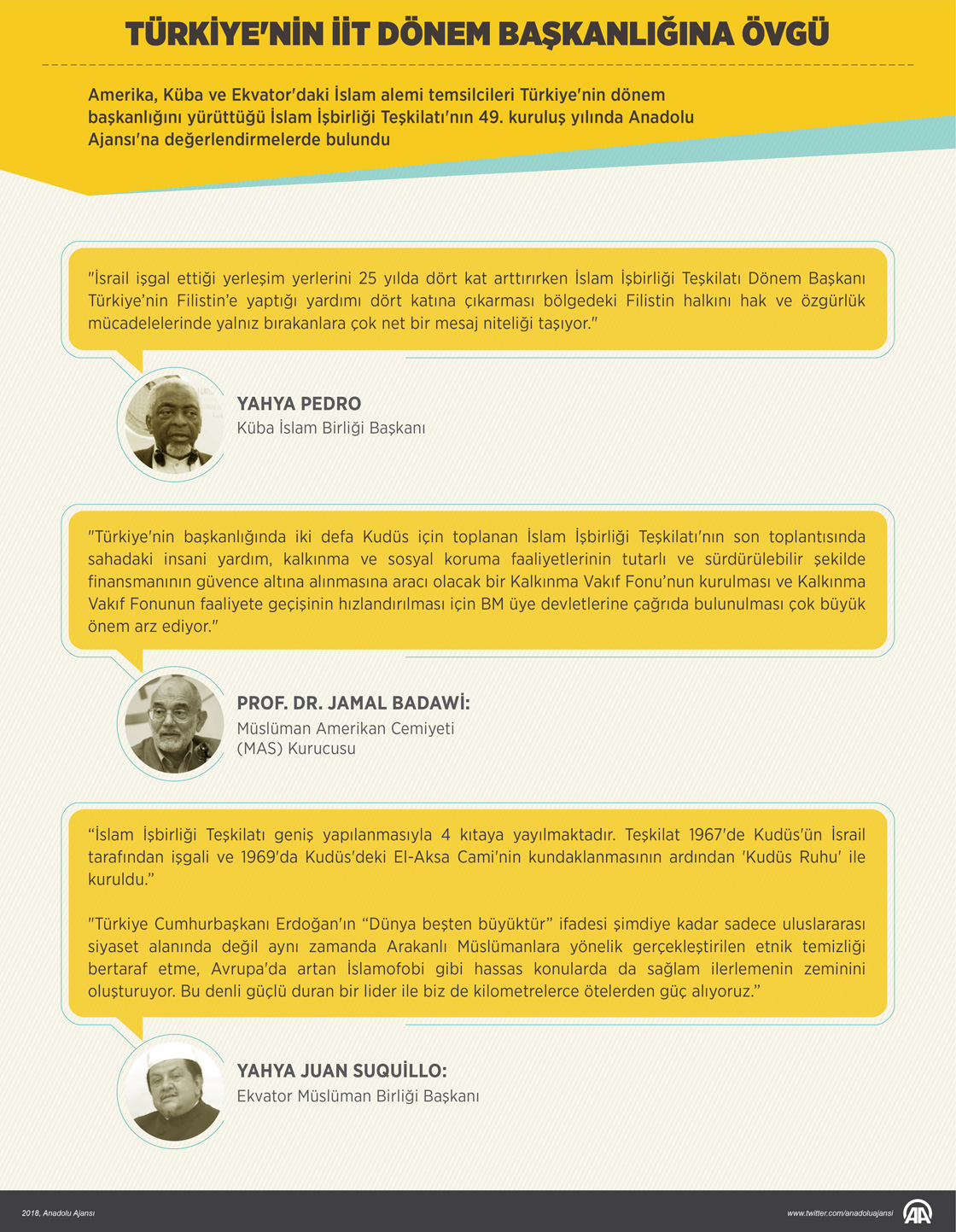 Amerika, Küba ve Ekvator'daki İslam alemi temsilcileri Türkiye'nin dönem başkanlığını yürüttüğü İslam İşbirliği Teşkilatı'nın 49. kuruluş yılında Anadolu Ajansı'na değerlendirmelerde bulundu. ( Yasin Demirci - Anadolu Ajansı )