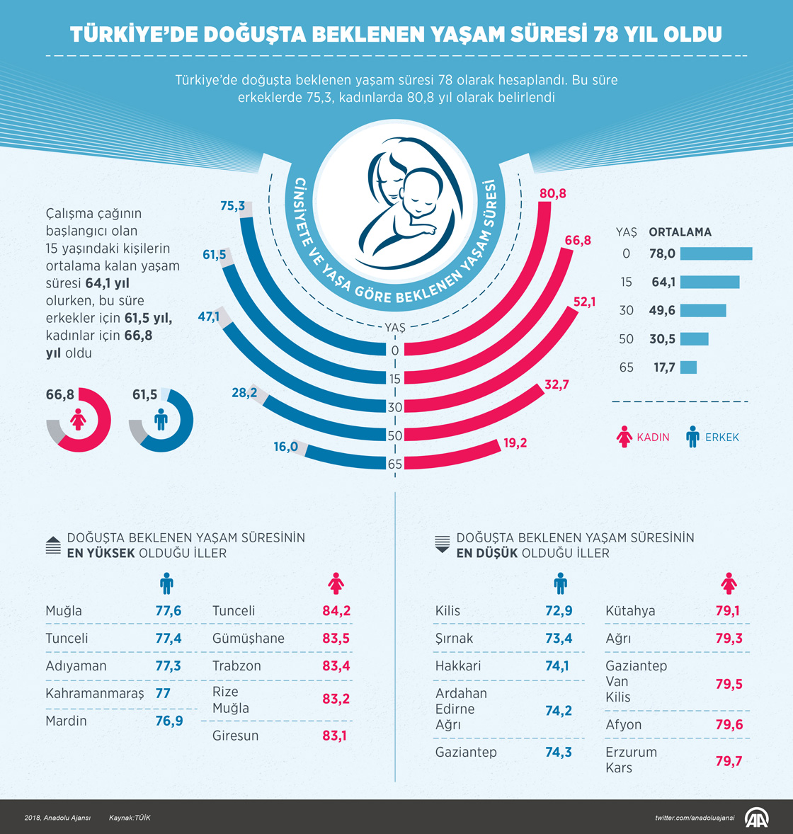 Türkiye’de doğuşta beklenen yaşam süresi, 78 yıl olarak hesaplandı. Türkiye İstatistik Kurumu (TÜİK), "Hayat Tabloları, 2015-2017" istatistiklerini açıkladı. Buna göre, doğuşta beklenen yaşam süresi, Türkiye geneli için toplamda 78 yıl olarak belirlendi. Bu süre, erkeklerde 75,3, kadınlarda 80,8 yıl olarak hesaplandı. Genel olarak kadınlar erkeklerden daha uzun süre yaşarken, doğuşta beklenen yaşam süresi farkı 5,5 yıl oldu. Çalışma çağının başlangıcı olan 15 yaşındaki kişilerin ortalama kalan yaşam süresi 64,1 yıl olurken, bu süre erkekler için 61,5 yıl, kadınlar için 66,8 yıl olarak belirlendi. ( Murat Usubaliev - Anadolu Ajansı )27 Eylül 2018•Güncelleme: 27 Eylül 2018