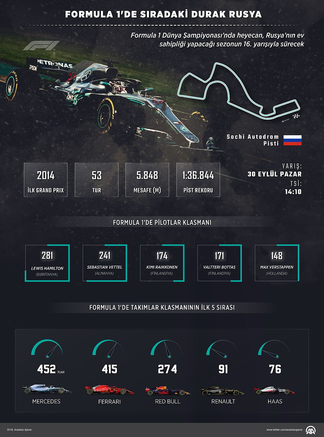 Formula 1 Dünya Şampiyonası'nda heyecan, Rusya'nın ev sahipliği yapacağı sezonun 16. yarışıyla sürecek. Rusya'nın Soçi kentiyle aynı adı taşıyan 5,848 kilometrelik pistte, 53 tur üzerinden yapılacak yarışın sıralama turları yarın TSİ 15.00'te başlayacak. Yarış ise 30 Eylül Pazar günü TSİ 14.10'da gerçekleştirilecek. (Ahmet Burak Özkan - Anadolu Ajansı)28 Eylül 2018•Güncelleme: 28 Eylül 2018