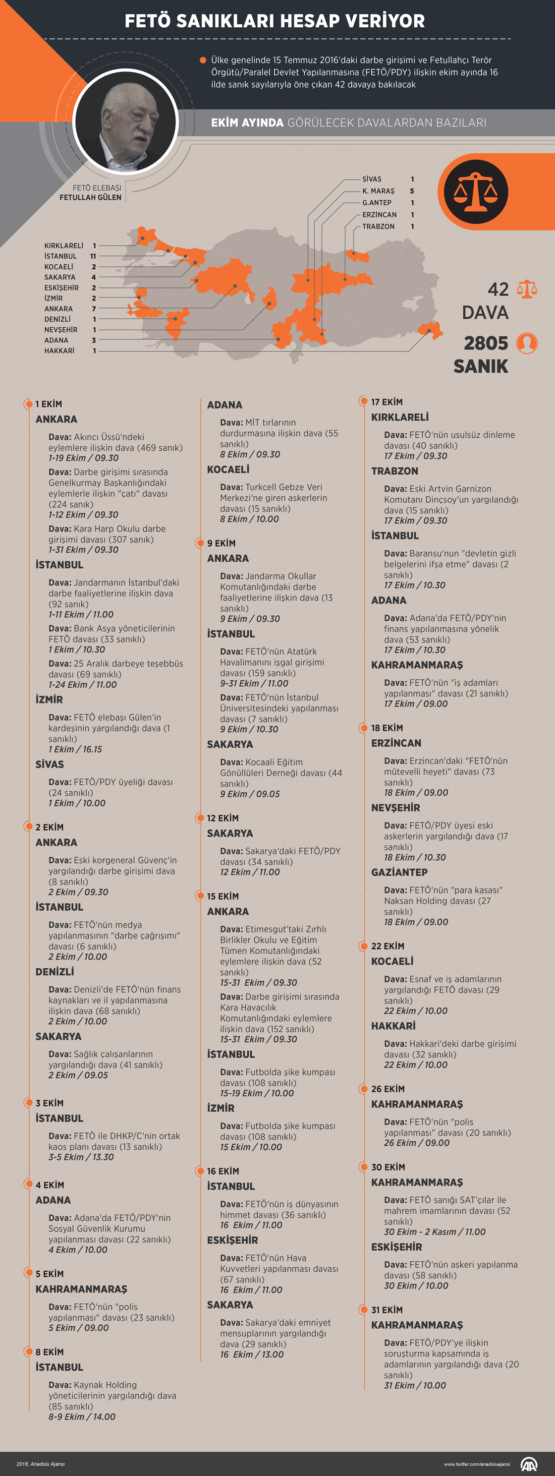 Ülke genelinde 15 Temmuz 2016'daki darbe girişimi ve Fetullahçı Terör Örgütü/Paralel Devlet Yapılanması'na (FETÖ/PDY) ilişkin ekim ayında 16 ilde sanık sayılarıyla öne çıkan 42 davaya bakılacak.
