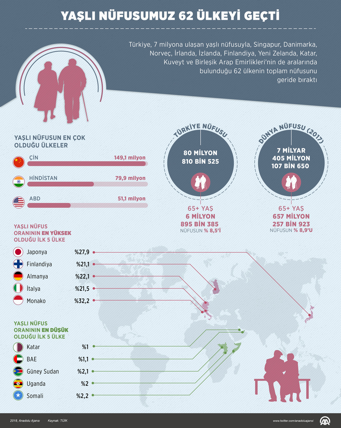 Türkiye, 6 milyon 895 bin 385 kişilik yaşlı nüfusuyla Singapur, Danimarka, Norveç, İrlanda, İzlanda, Finlandiya, Yeni Zelanda, Katar, Kuveyt ve Birleşik Arap Emirlikleri'nin de aralarında olduğu 62 ülkenin toplam nüfusunu geçti. ( Muhammed Ali Yiğit - Anadolu Ajansı )01 Ekim 2018•Güncelleme: 01 Ekim 2018