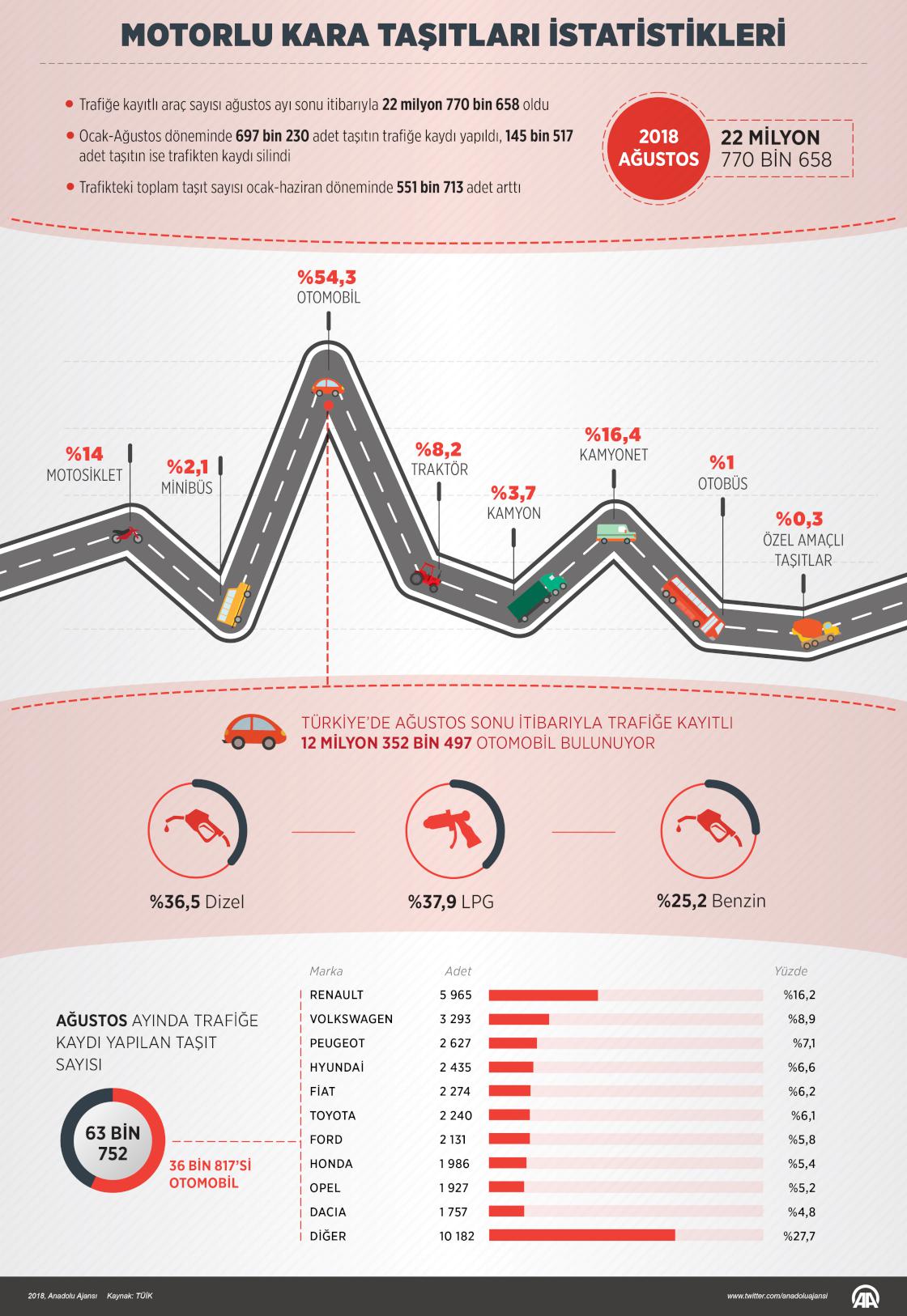 Türkiye İstatistik Kurumu (TÜİK), ağustos ayına ilişkin motorlu kara taşıtları istatistiklerini açıkladı. Türkiye'de ocak-ağustos döneminde 697 bin 230 taşıtın trafiğe kaydı yapıldı, 145 bin 517 taşıtın ise trafikten kaydı silindi. Böylece trafikteki toplam taşıt sayısı 551 bin 713 arttı.