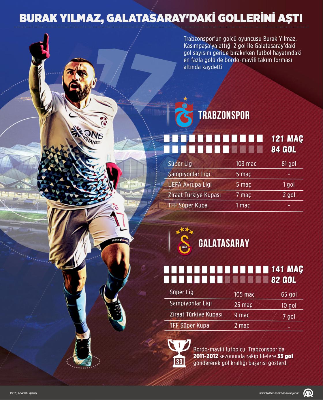 Sarı-kırmızılı takımda 141 resmi maçta 82 kez rakip fileleri havalandıran Burak Yılmaz, Trabzonspor formasıyla Kasımpaşa'ya attığı gollerle 121. resmi maçında 84. golünü kaydederek futbol hayatında bir takımdaki en fazla gol sayısına ulaştı. ( Mevlüt Eren - Anadolu Ajansı )02 Ekim 2018•Güncelleme: 02 Ekim 2018