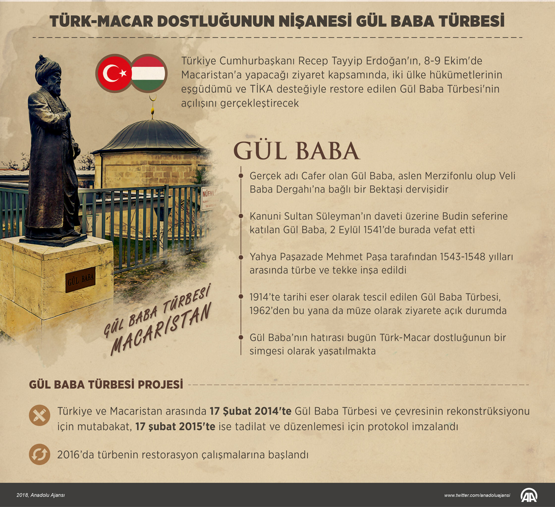 Türkiye Cumhurbaşkanı Recep Tayyip Erdoğan'ın, 8-9 Ekim'de Macaristan'a yapacağı ziyaret kapsamında, iki ülke hükümetlerinin eşgüdümü ve Türk İşbirliği ve Koordinasyon Ajansı Başkanlığının (TİKA) desteğiyle restore edilen Gül Baba Türbesi'nin açılışını gerçekleştirmesi bekleniyor. ( Muhammed Ali Yiğit - Anadolu Ajansı )08 Ekim 2018•Güncelleme: 08 Ekim 2018