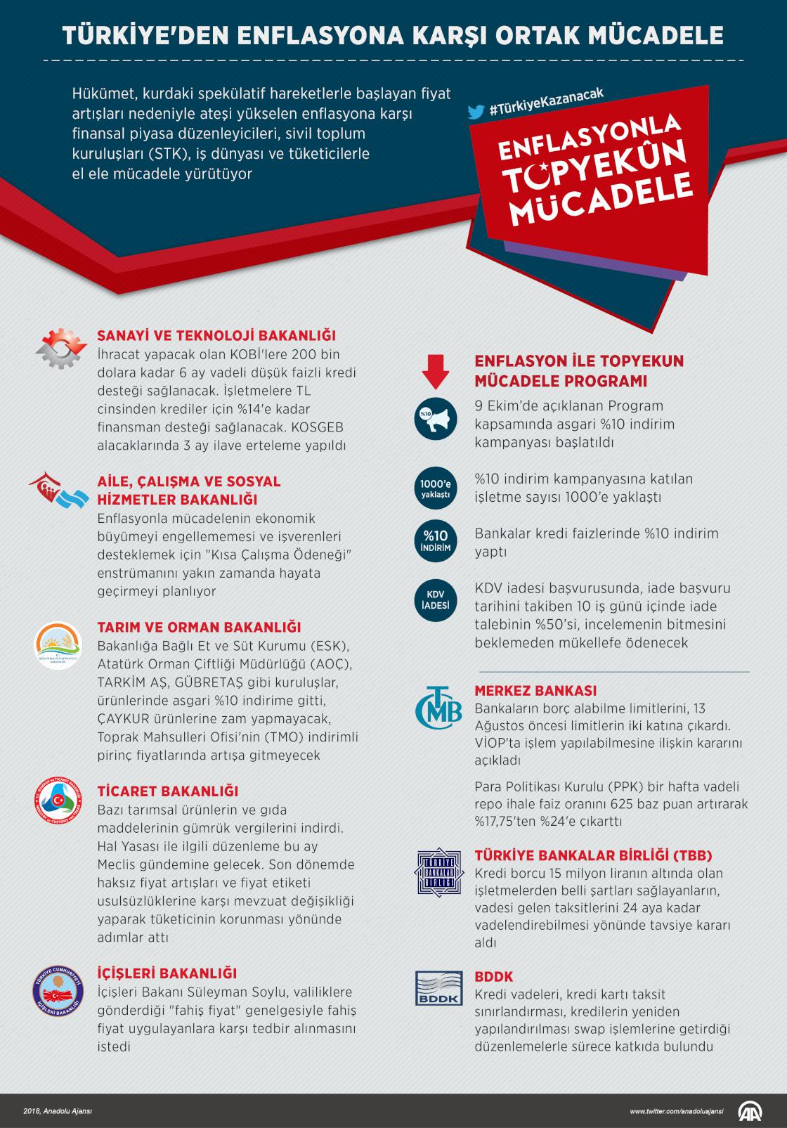 Hükümet, kurdaki spekülatif hareketlerle başlayan fiyat artışları nedeniyle ateşi yükselen enflasyona karşı finansal piyasa düzenleyicileri, sivil toplum kuruluşları (STK), iş dünyası ve tüketicilerle el ele mücadele yürütüyor. ( Muhammed Ali Yiğit - Anadolu Ajansı )15 Ekim 2018•Güncelleme: 15 Ekim 2018