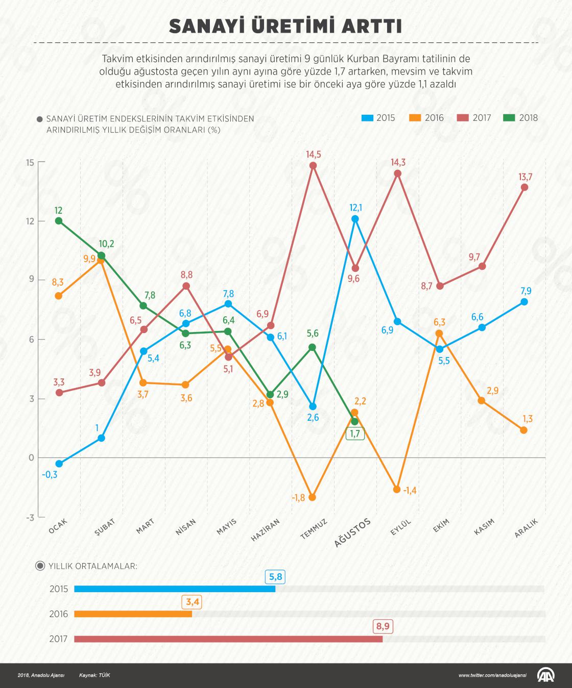 Takvim etkisinden arındırılmış sanayi üretimi 9 günlük Kurban Bayramı tatilinin de olduğu ağustosta geçen yılın aynı ayına göre yüzde 1,7 artarken, mevsim ve takvim etkisinden arındırılmış sanayi üretimi ise bir önceki aya göre yüzde 1,1 azaldı. ( Ahmet Burak Özkan - Anadolu Ajansı )16 Ekim 2018•Güncelleme: 16 Ekim 2018
