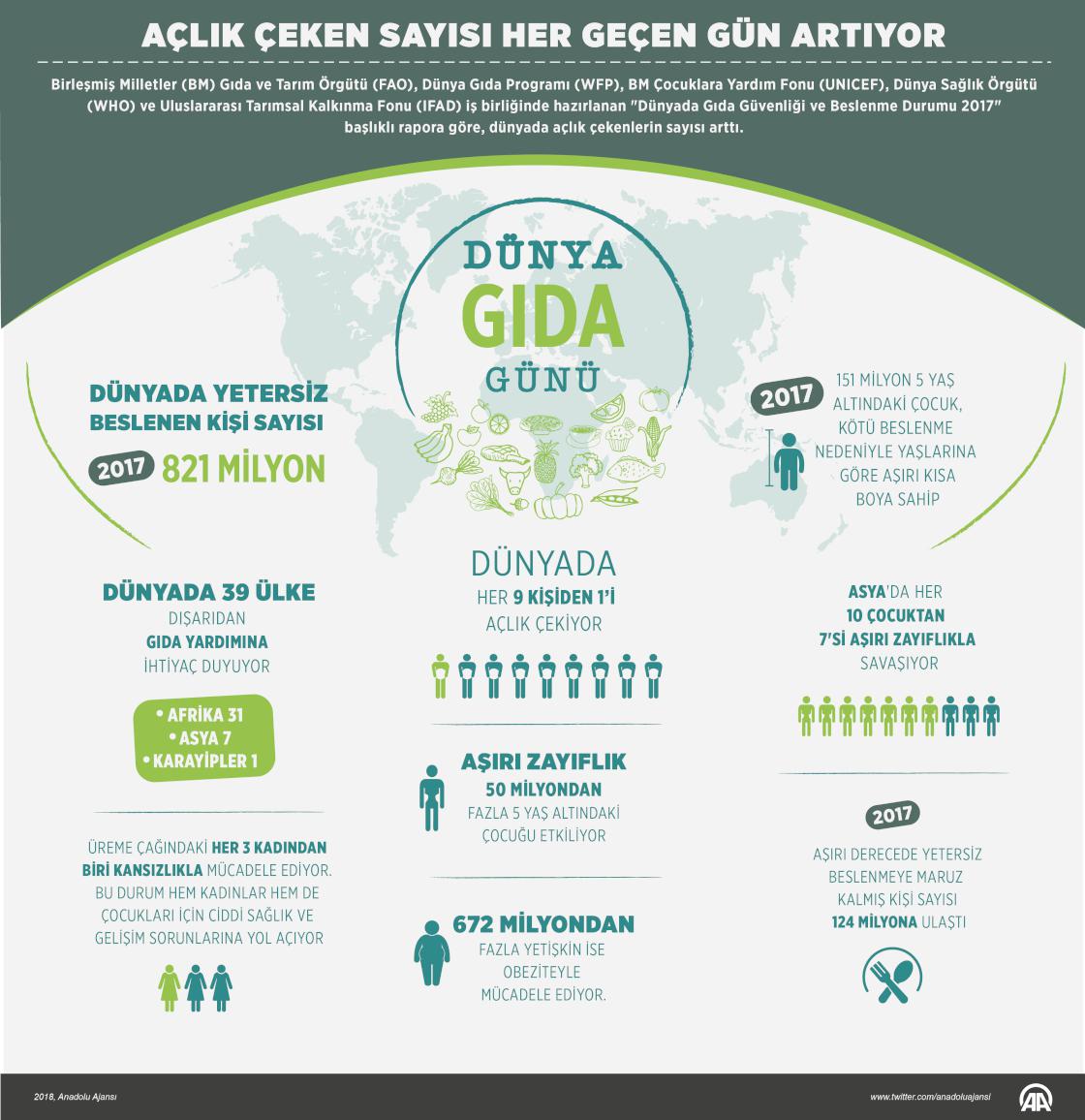 AA muhabirinin Birleşmiş Milletler (BM) Gıda ve Tarım Örgütü (FAO), Dünya Gıda Programı (WFP), BM Çocuklara Yardım Fonu (UNICEF), Dünya Sağlık Örgütü (WHO) ve Uluslararası Tarımsal Kalkınma Fonu (IFAD) iş birliğinde hazırlanan "Dünyada Gıda Güvenliği ve Beslenme Durumu 2017" başlıklı rapordan derlediği bilgilere göre, dünyada açlık çekenlerin sayısı arttı. Geçen yıl yetersiz beslenenlerin sayısı 821 milyona ulaşırken, bu rakam her 9 kişiden birine tekabül ediyor. ( Gözde Gültekinler - Anadolu Ajansı )16 Ekim 2018•Güncelleme: 16 Ekim 2018