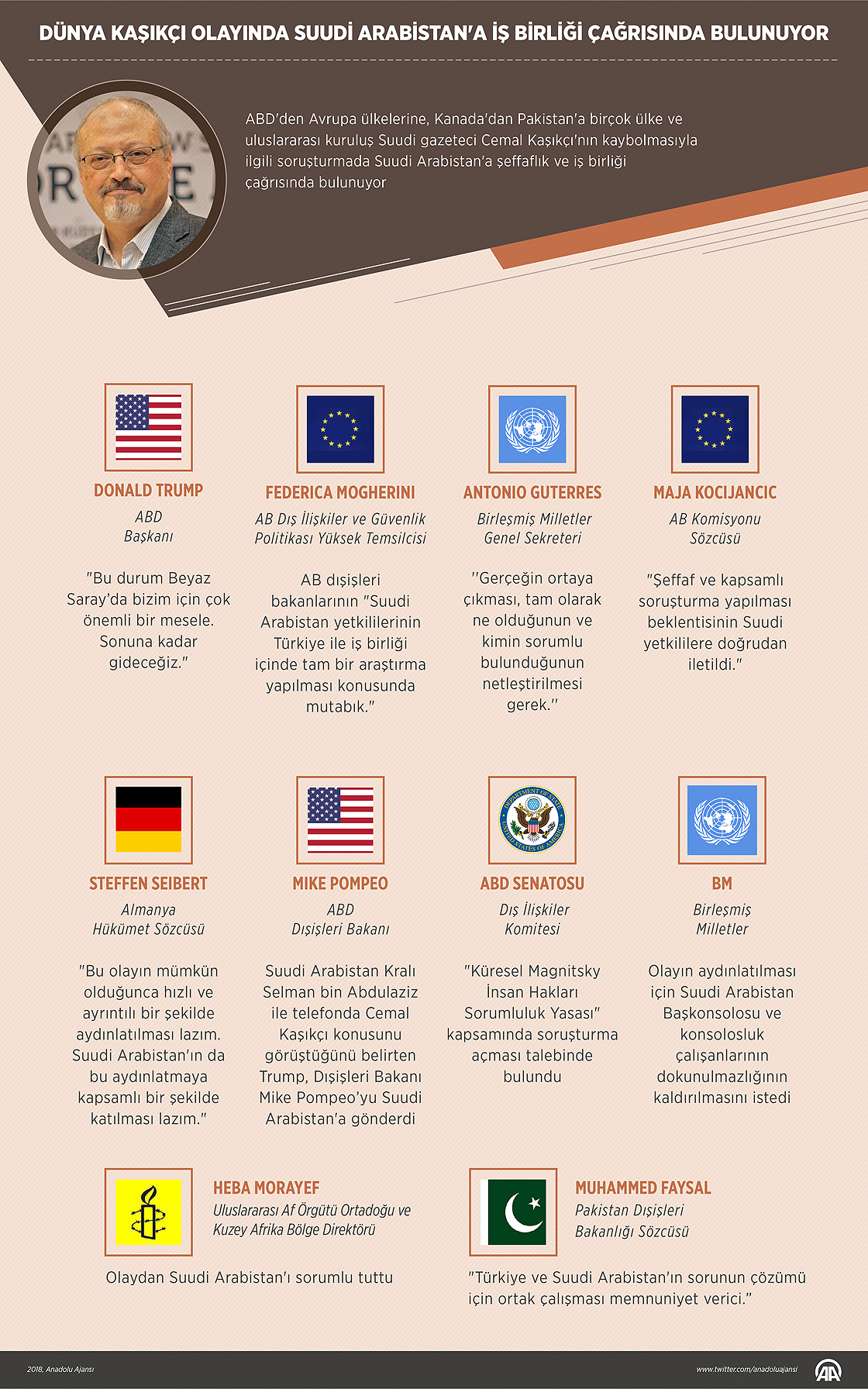 ABD'den Avrupa ülkelerine, Kanada'dan Pakistan'a birçok ülke ve uluslararası kuruluşlar Washington Post yazarı Suudi gazeteci Cemal Kaşıkçı'nın kaybolmasıyla ilgili soruşturmada Suudi Arabistan'a şeffaflık ve iş birliği çağrısında bulunuyor.