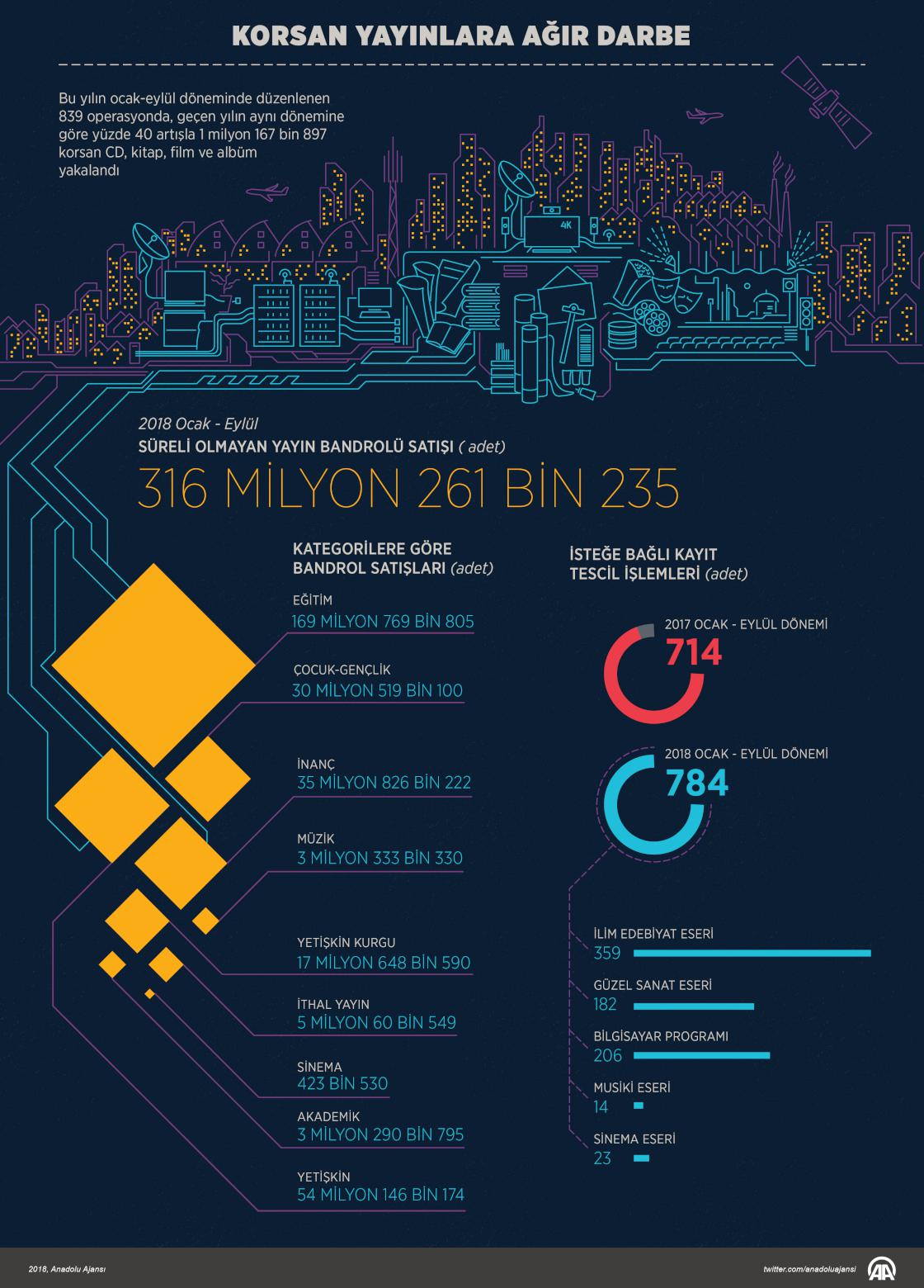 Kültür ve Turizm Bakanlığından yapılan açıklamada, müzik, sinema yapımları ile kitaplara ilişkin bandrol sayıları ve fikir sanat eserleri tescil işlemlerinin 9 aylık rakamlarına yer verildi. Telif Hakları Genel Müdürlüğünün bandrol ve tescil istatistiklerine göre, süreli olmayan yayın bandrolü satışı bu yılın 9 ayında, geçen yılın aynı dönemine göre yüzde 0,1 artışla 316 milyon 261 bin 235'e yükseldi. ( Murat Usubaliev - Anadolu Ajansı )17 Ekim 2018•Güncelleme: 17 Ekim 2018