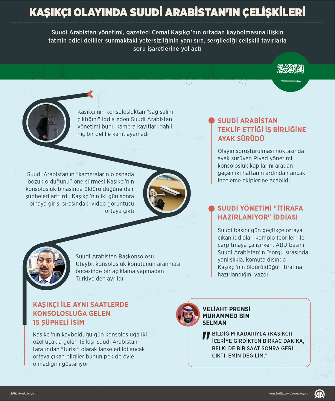 Suudi Arabistan yönetimi, gazeteci Cemal Kaşıkçı'nın ortadan kaybolmasına ilişkin tatmin edici deliller sunmaktaki yetersizliğinin yanı sıra, sergilediği çelişkili tavırlarla soru işaretlerine yol açtı. ( Yasin Demirci - Anadolu Ajansı )