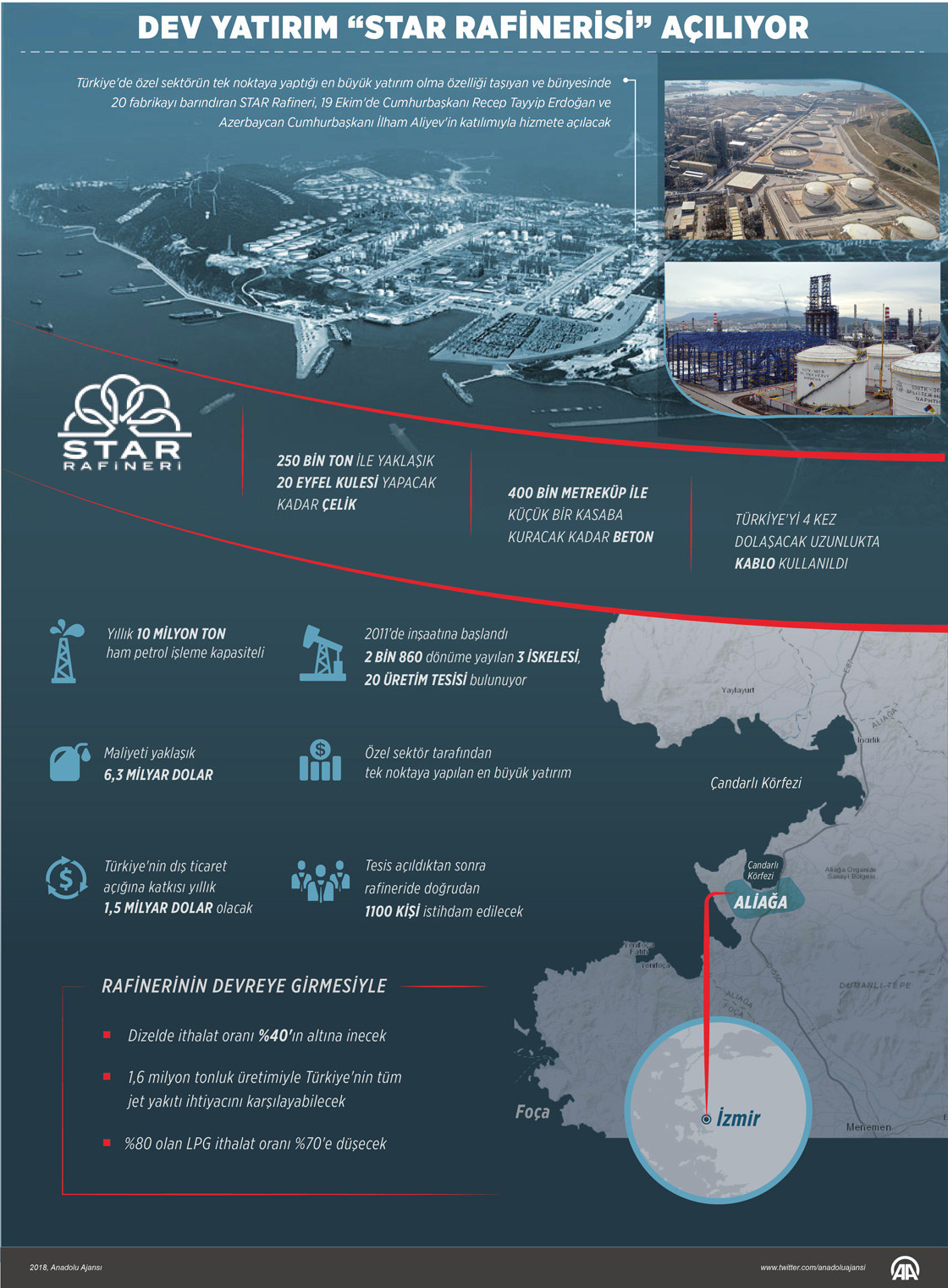 Azerbaycan Devlet Petrol Şirketi SOCAR'ın iştiraki SOCAR Türkiye tarafından inşa edilen "STAR Rafinerisi"nin açılış töreni, Türkiye Cumhurbaşkanı Recep Tayyip Erdoğan'ın himayesinde yarın İzmir'in Aliağa ilçesinde gerçekleştirilecek.