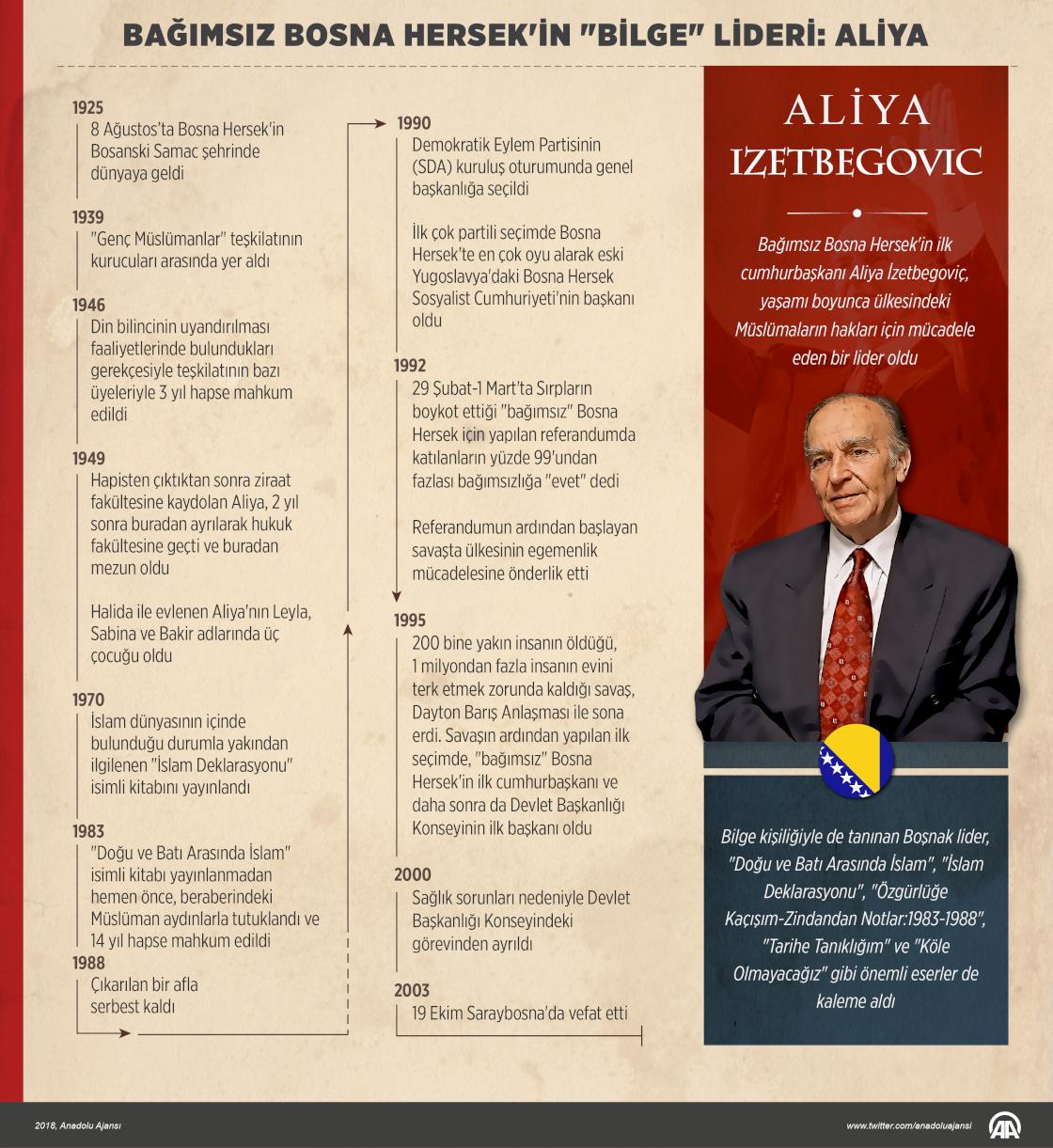 15 yıl önce bugün hayata gözlerini yuman bağımsız Bosna Hersek'in ilk cumhurbaşkanı Aliya İzetbegoviç, yaşamı boyunca ülkesindeki Müslümaların hakları için mücadele eden bir lider oldu. Bilge kişiliğiyle de tanınan Boşnak lider, "Doğu ve Batı Arasında İslam", "İslam Deklarasyonu", "Özgürlüğe Kaçışım-Zindandan Notlar:1983-1988", "Tarihe Tanıklığım" ve "Köle Olmayacağız" gibi önemli eserler de kaleme aldı.