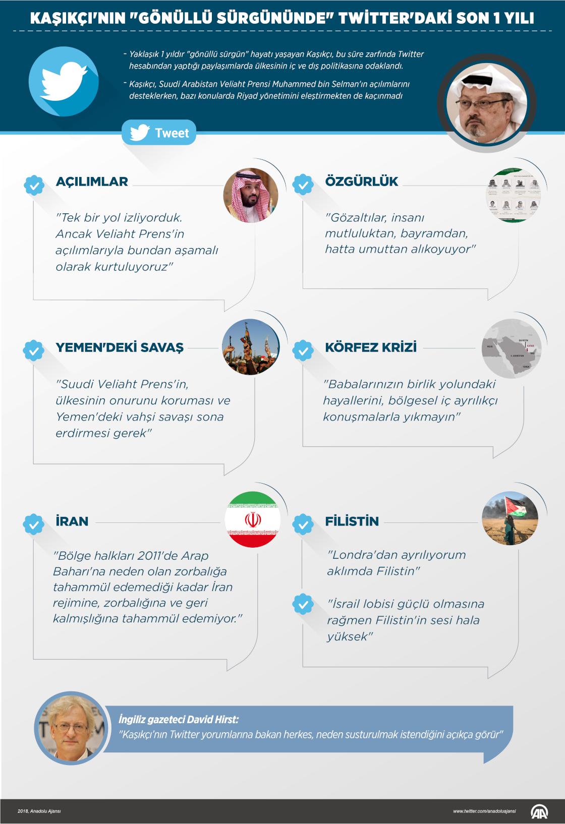 Suudi Arabistan'ın İstanbul Başkonsolosluğu'na girdikten sonra kendisinden bir daha haber alınamayan Washington Post yazarı Suudi gazeteci Cemal Kaşıkçı, yaklaşık 1 yıldır "gönüllü sürgün" hayatı yaşıyordu. Kaşıkçı, bu süre zarfında Twitter hesabından yaptığı paylaşımlarda ülkesinin iç ve dış politikasına odaklandı. ( Gözde Gültekinler - Anadolu Ajansı )19 Ekim 2018•Güncelleme: 19 Ekim 2018