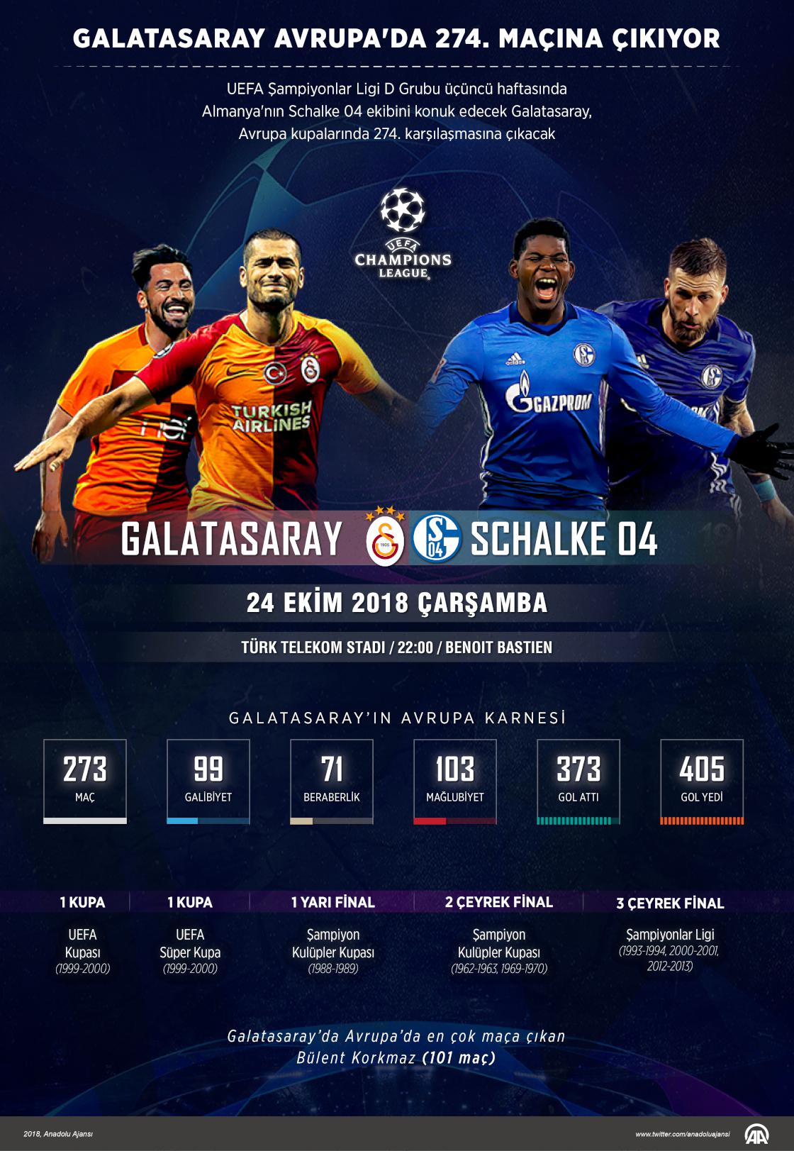 UEFA Şampiyonlar Ligi D Grubu üçüncü haftasında yarın Almanya'nın Schalke 04 ekibini konuk edecek Galatasaray, Avrupa kupalarında 274. karşılaşmasına çıkacak. ( Muhammed Ali Yiğit - Anadolu Ajansı )