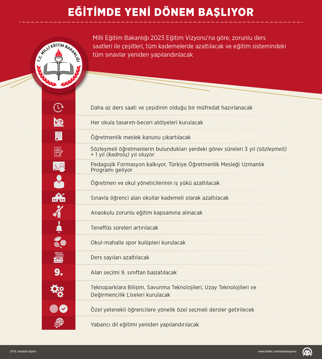 Milli Eğitim Bakanlığı 2023 Eğitim Vizyonu'na göre, zorunlu ders saatleri ile çeşitleri, tüm kademelerde azaltılacak ve eğitim sistemindeki tüm sınavlar yeniden yapılandırılacak.