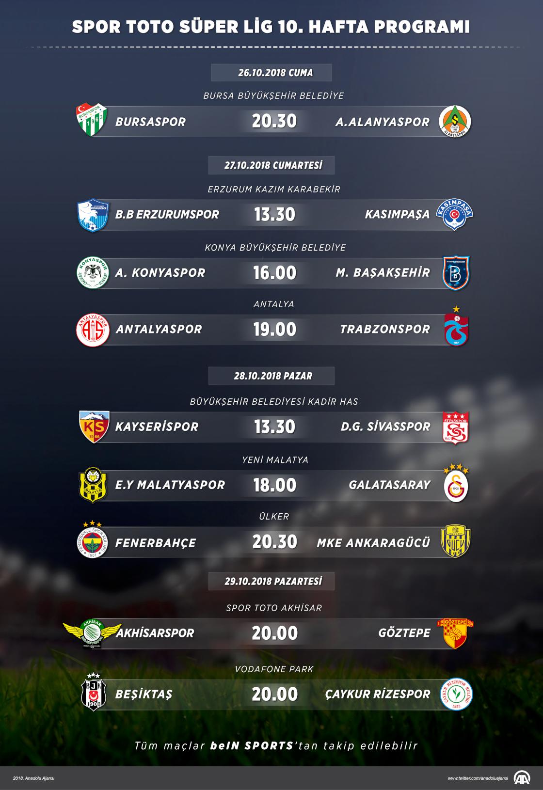 Spor Toto Süper Lig'de 10. haftanın açılış maçında bugün Bursaspor ile Aytemiz Alanyaspor karşı karşıya gelecek. Ligde 27 Ekim Cumartesi ve 28 Ekim Pazar günü 3, 22 Ekim Pazartesi ise 2 maç oynanacak.