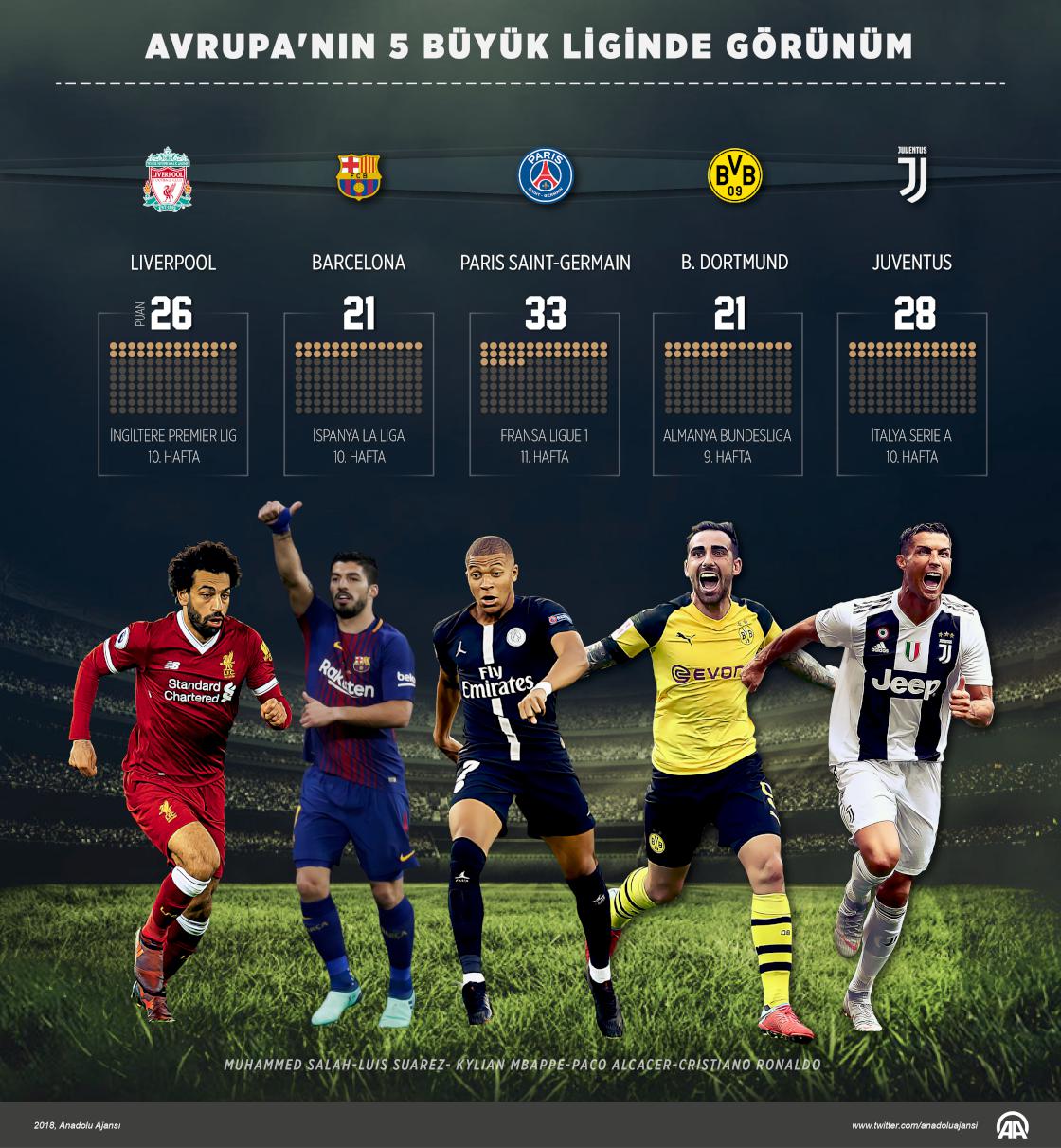 Avrupa'nın en büyük 5 futbol ligi kabul edilen İngiltere (Premier Lig), İspanya (La Liga), İtalya (Serie A), Almanya (Bundesliga) ve Fransa'daki (Ligue 1) karşılaşmalara, hafta sonu devam edildi. İngiltere'de Liverpool İspanya'da Barcelona, İtalya'da Juventus, Almanya'da Borussia Dortmund, Fransa'da ise Paris Saint-Germain (PSG), puan tablosunun zirvesinde yer aldı. ( Mevlüt Eren - Anadolu Ajansı )29 Ekim 2018•Güncelleme: 29 Ekim 2018