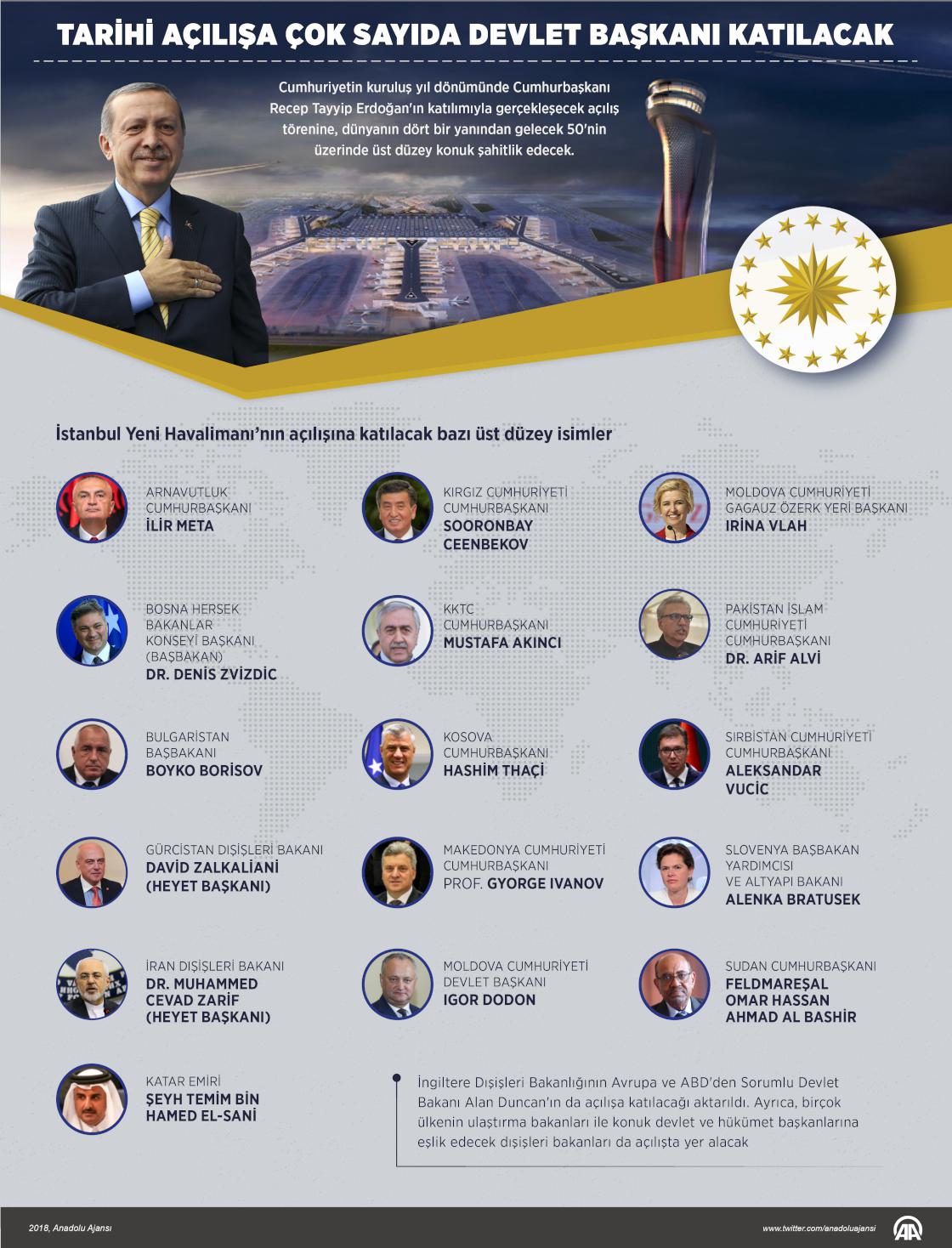 İstanbul Yeni Havalimanı'nın ilk etabı, Cumhurbaşkanı Recep Tayyip Erdoğan ve çok sayıda devlet başkanının katılımıyla saat 16.30'da hizmete açılıyor. İstanbul Yeni Havalimanı'nın ilk fazı, Cumhurbaşkanı Recep Tayyip Erdoğan'ın katılacağı programla bugün saat 16.30'da uçuşa açılıyor. Tamamlandığında dünyanın en büyük havalimanı olacak İstanbul Yeni Havalimanı'nın ilk etabının açılışına geri sayım başlarken, açılış törenine saatler kaldı. Cumhuriyetin kuruluş yıl dönümünde Cumhurbaşkanı Recep Tayyip Erdoğan'ın katılımıyla gerçekleşecek açılış törenine, dünyanın dört bir yanından gelecek 50'nin üzerinde üst düzey konuk şahitlik edecek. ( Gözde Gültekinler - Anadolu Ajansı )29 Ekim 2018•Güncelleme: 29 Ekim 2018