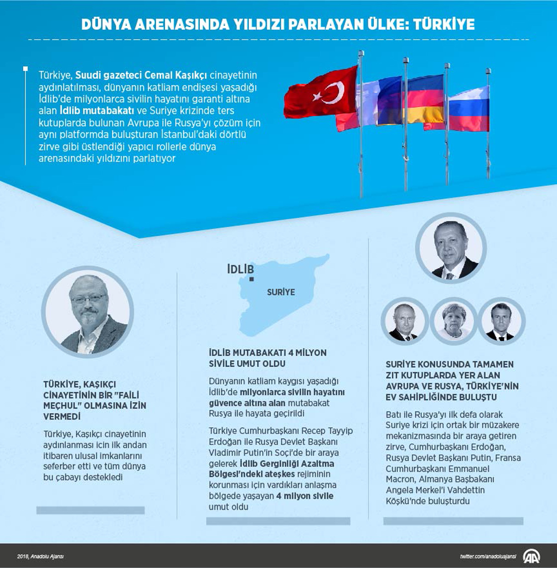 Türkiye, Suudi gazeteci Cemal Kaşıkçı cinayetinin aydınlatılması, dünyanın katliam endişesi yaşadığı İdlib'de milyonlarca sivilin hayatını garanti altına alan İdlib mutabakatı ve Suriye krizinde ters kutuplarda bulunan Avrupa ile Rusya'yı çözüm için aynı platformda buluşturan İstanbul'daki dörtlü zirve gibi üstlendiği yapıcı rollerle dünya arenasındaki yıldızını parlatıyor29 Ekim 2018•Güncelleme: 29 Ekim 2018